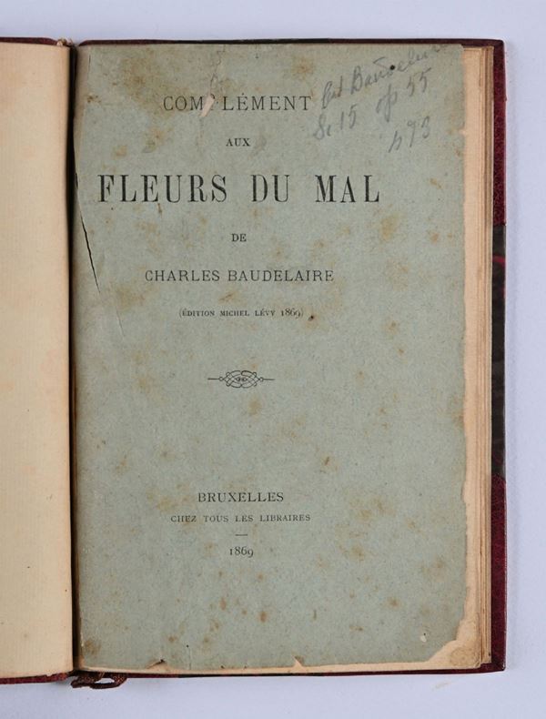 1 vol. Leg. art. pp. 36-[2], mm 180x125. Prima edizione, include i versi dei 6 sonetti censurati dall’edizione originale de I Fiori del Male. Legatura artistica in mezza pelle con angoli e fregi in oro, si conserva la brossura. Ex-libris di Gian Carlo Del Vecchio. Rarità.