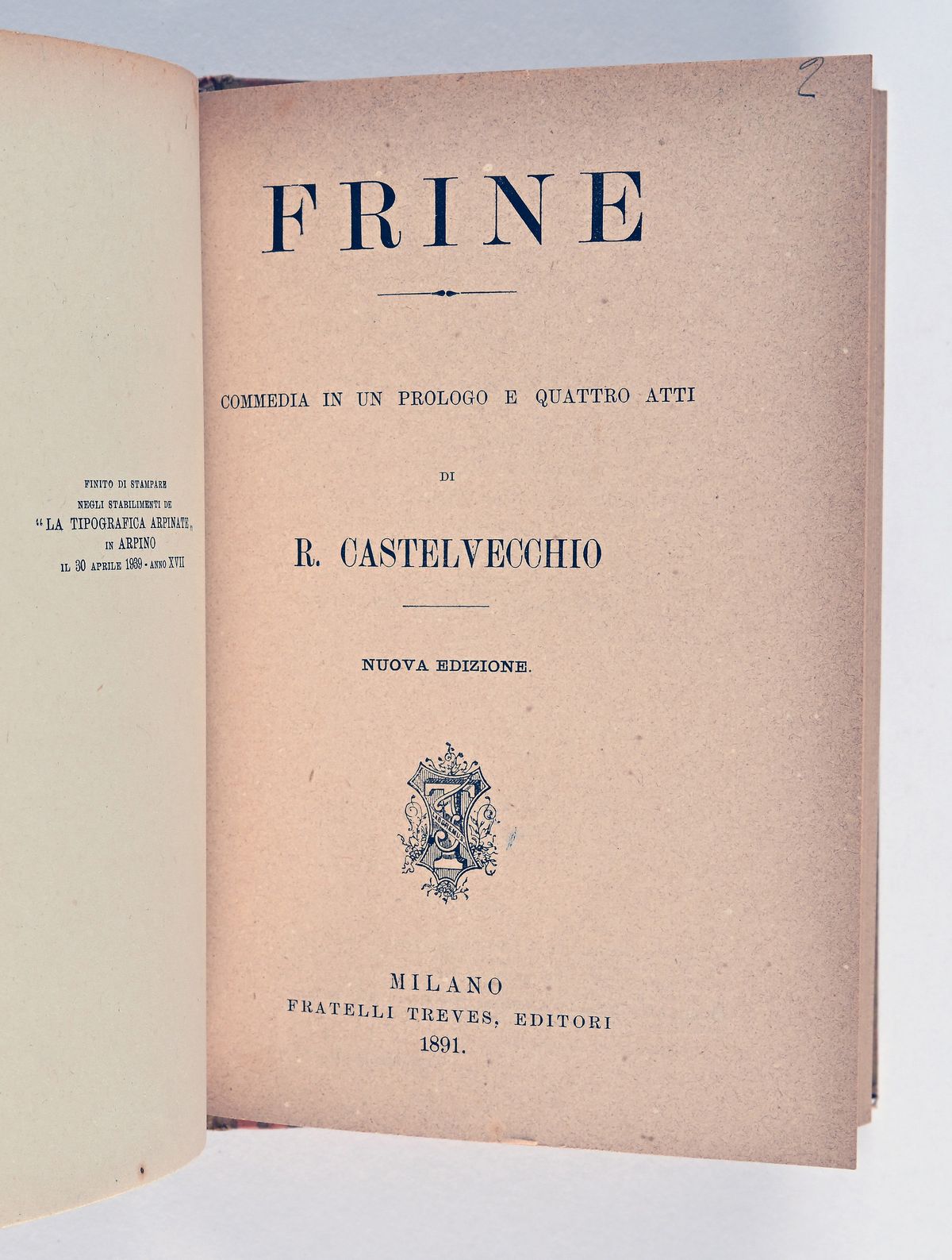 1 vol. pp. 150/[6]-105-[7], mm 178x130. Due opere dello stesso autore rilegate in un volume: legato con FRINE (1891, Milano, Fratelli Treves). Rilegatura post. in cartonato decorato con titoli in oro al dorso.