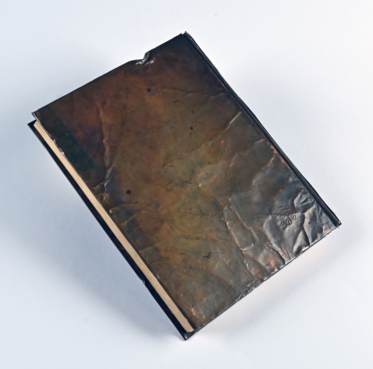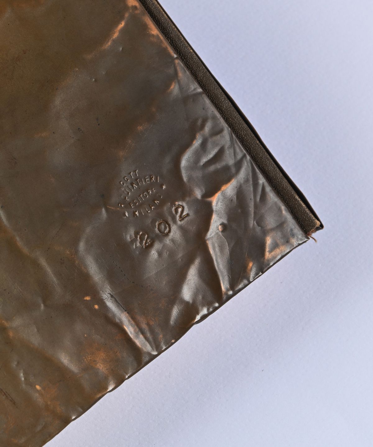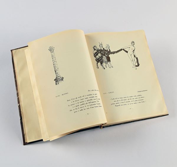In 8°. Volume di pregio. Una delle 500 copie numerate a sbalzo sul rame nella copertina posteriore, stampate su carta patinata con la legatura di lusso ns. esemplare n. 202. Raccolta di versi delle letteratura greca tratti dall'Antologia Palatina, con belle e nitide illustrazioni xilografiche di Adolfo Magrini. Legatura editoriale in rame (piatti e dorso) con titoli e grande illustrazione sbalzata su disegno di Adolfo Magrini al piatto anteriore.