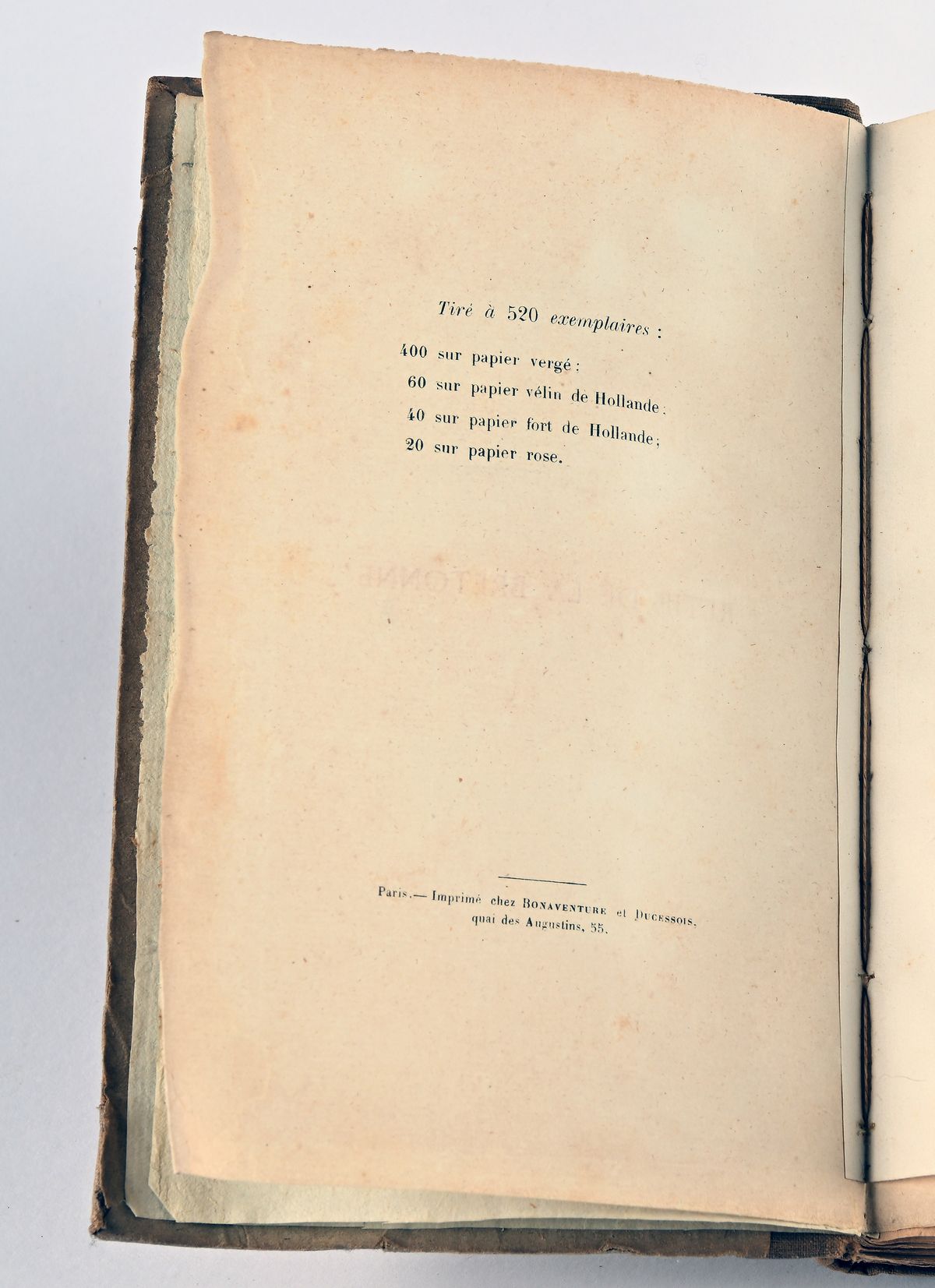 1 vol. mm 190x125, in 8°, p. [4], 210 + 2 tav. f.t. Rilegatura in mezza tela, dorso con titoli impressi a secco. Al frontespizio: Documents inédits - Ses malheurs - Sa vieillesse et sa vie - Ce qui a été écrit sur lui - Ses descendants - Catalogue complet et détail de ses ouvrages suivi de quelques extraits. Avec un beau portrait gravé par Nargeot et un fac-similé. Edizione tirata in 520 esemplari non numerati; con 1 ritratto in antiporta e 1 fac-simile ripiegato in fine, front. e occh. stampati a col. Buono stato di conservazione con lievi fioriture e lievi segni del tempo ai piatti.