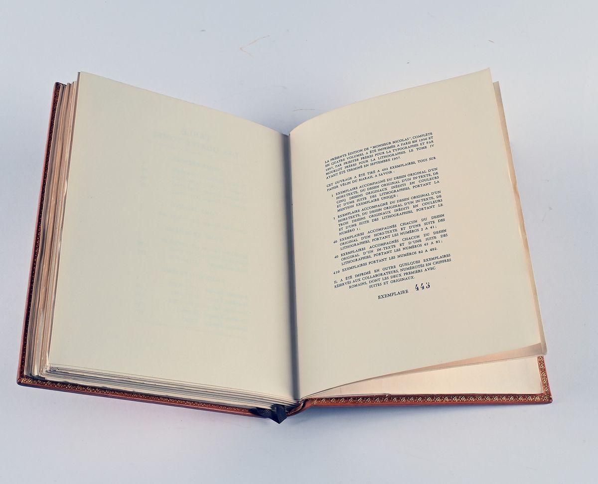 Tiratura limitata su carta "vélin du marais", numerata a 492 esemplari, ns n. 443. Pregevoli legature in pieno vitello con 5 nervi ai dorsi con fregi e titoli in oro. Piatti incisi e decorati in oro Entro cofanetti telati e cartonati. Copertine originali conservate.