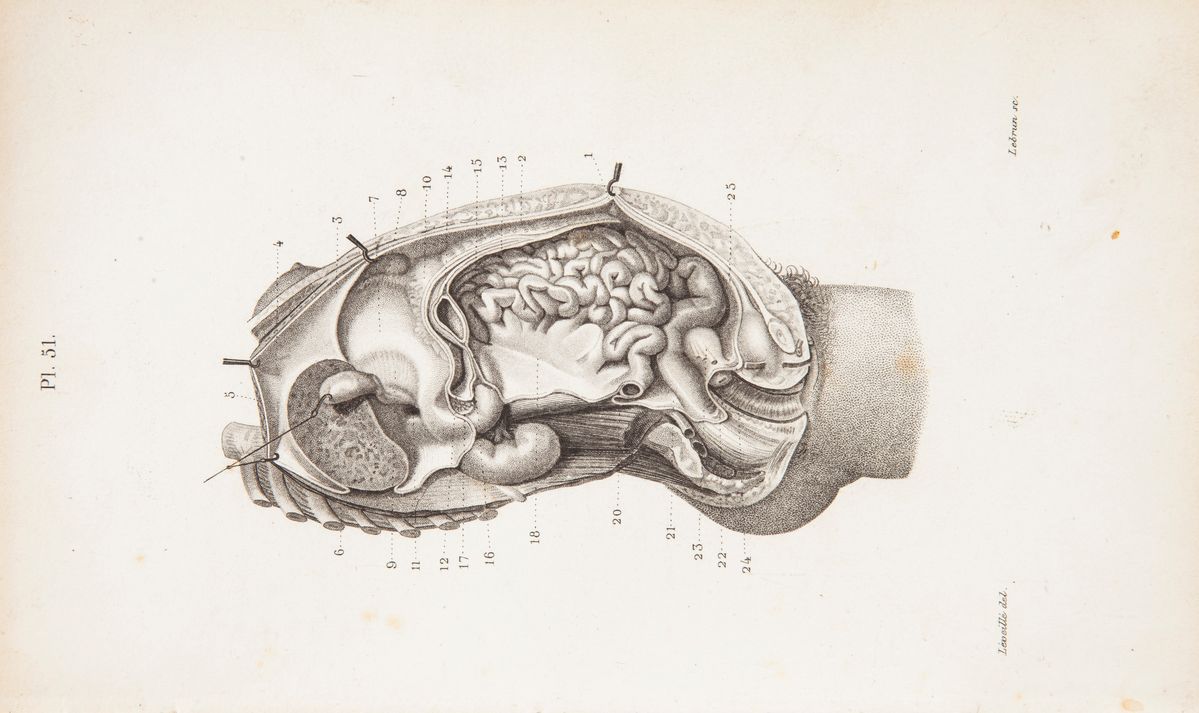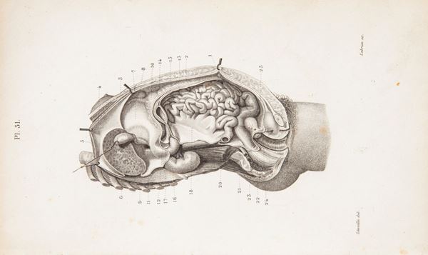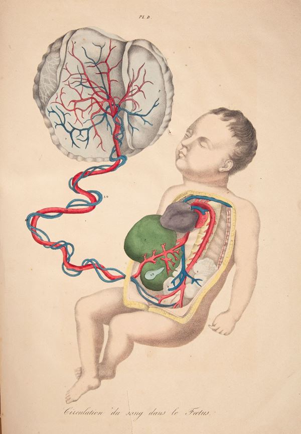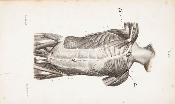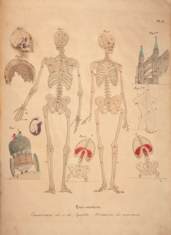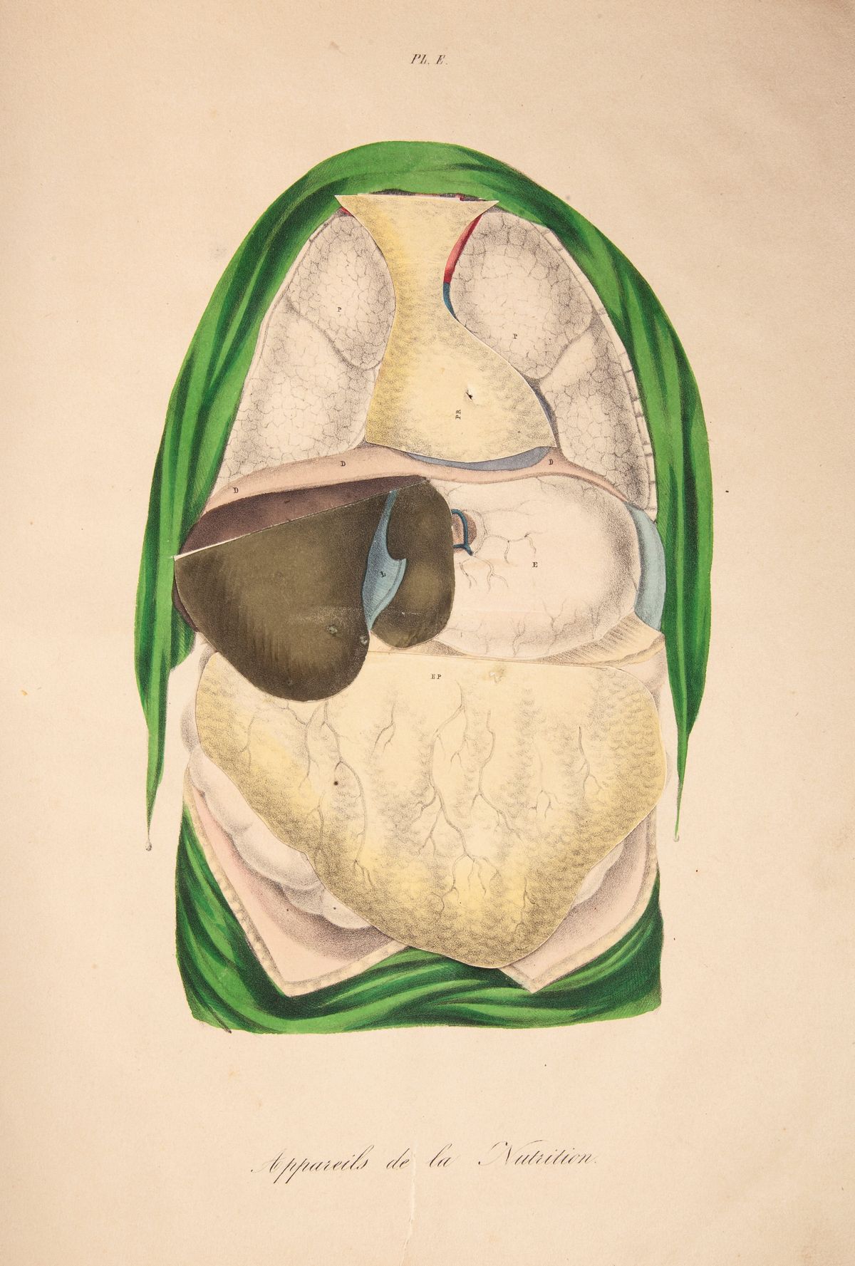 Atlante di Anotomia con 113 tavole litografiche (44 e 44bis), ognuna con una pagina di spiegazioni cui seguono altre 19 tavole litografiche (alcune ripiegate) anch'esse con una pagina di spiegazioni. Leggermente slegato. Legatura in piena tela coeva. Physiologie con 12 Tavole mobili a colori raffiguranti il corpo umano. Legatura originale in cartonato (con difetti e parzialmente slegata).