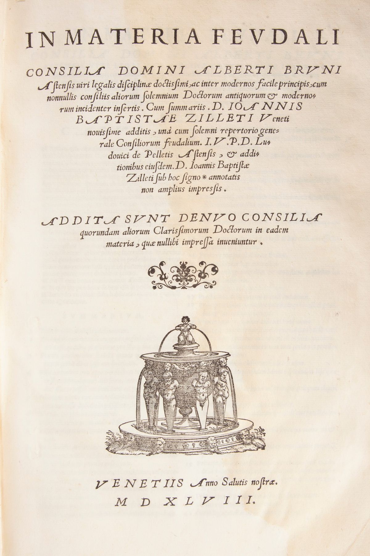 Alberto Bruno - Feudalia consilia ac responsa D. Alberti Bruni Astensis; cum nonnullis consiliis aliorum solemnium doctorum antiquorum & modernorum incidenter insertis. Addita sunt denuo consilia quorundam aliorum clarissimorum doctorum in eadem materia, quae nullibi impressa inueniuntur ... Cum summariis & alphabetico repertorio generali omnium consiliorum feudalium D. Ioannis Baptistae Zilleti Veneti nouissime impressum decorata, Al segno della Fontana, Venezia 1548