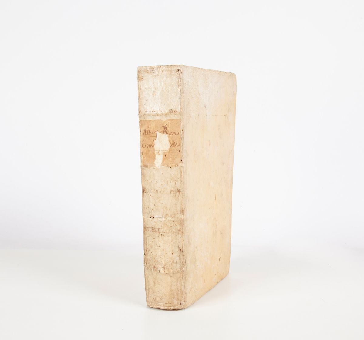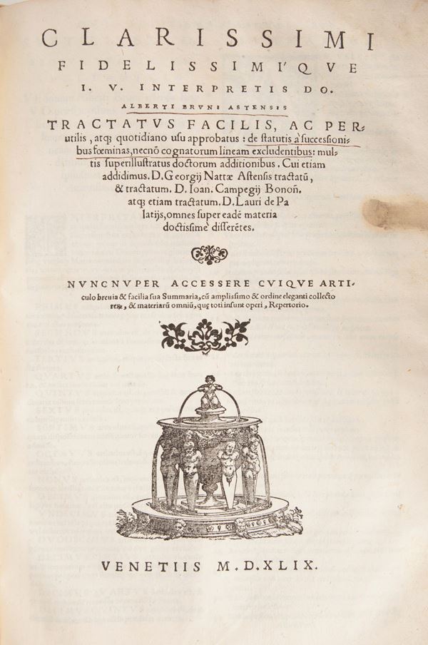 In 2° Il Tomo primo contiene il Repertorium, il secondo i Consilia con il titolo: In materia feudali consilia domini Alberti Bruni Astensis. Unito con Clarissimi fidelissimique I.V. interpretis Do. Alberti Bruni Astensis Tractatus facilis, ac perutilis, atque quotidano usu approbatus: de statutis à successionibus foeminas, necnon cognatorum lineam excludentibus multis superillustratus doctorum additionibus. Cui etiam addidimus .D. Georgij Nattae Astensis tractatum, & tractatum .D. Ioan. Campegij Bonon. atque etiam tractatum .D. Lauri de Palatijs, omnes super eadem materia doctissimè disserentes. Nunc nuper accessere cuique articulo breuia & facilia sua summaria, cum amplissimo & ordine eleganti collecto rerum, & materiarum omnium, quae toti insunt operi, repertorio; Al segno della fontana Venezia 1549. Frontespizio della prima opera per buona parte manoscritto eseguito a mano, mancanze alle prime 28 carte, che ledono parzialmente il testo fino alla 18. Due opere giuridiche (una sul diritto feudale e un repertorio sul diritto di successione) del giurista e saggista astigiano Alberto Bruno (1467-1541), avvocato fiscale generale dei Savoia e senatore di Milano. Legatura in piena pergamena del XVIII secolo con titolo su tassello di carta al dorso. Lotto non passibile di restituzione.