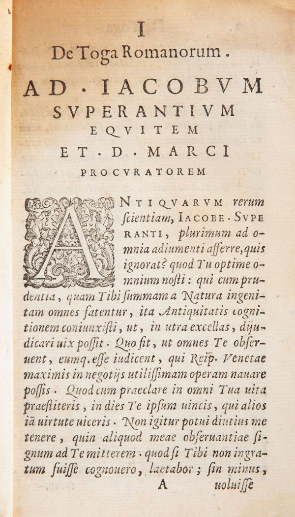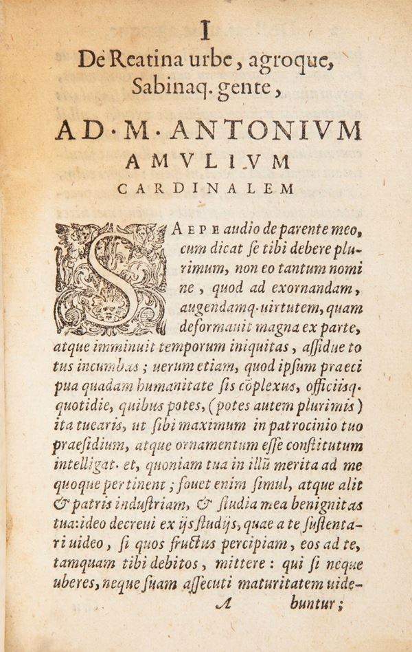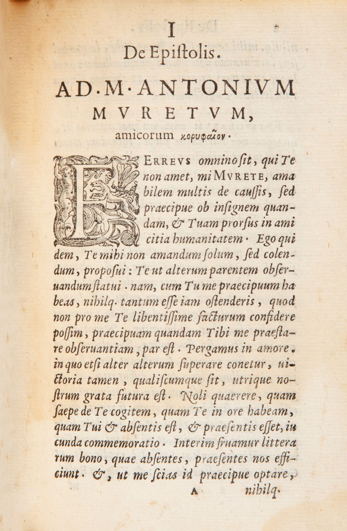 3 parti in una. In 8°. Con ritratto di Aldo Manuzio il Vecchio sul frontespizio. Testo in corsivo tondo. Rara prima edizione di quest'opera antiquaria scritta da Aldo il Giovane sotto forma di raccolta, dove questioni erudite vengono trattate ed illustrate in forma di epistole indirizzate ad amici e sodali quali Mureto, Sigonio e Pinelli, ma anche cardinali come G. Sirleto e A. Farneseche; tratta di arti liberali, di astronomia e questioni tolemaiche. Erudito della seconda generazione dell'Umanesimo italiano, fu l'ultimo membro della celebre famiglia attivo come stampatore a Venezia, figlio di Paolo Manuzio e nipote dell'omonimo famoso tipografo veneziano. Legatura del XIX in piena pelle. Leggere fioriture ad alcune pagine.