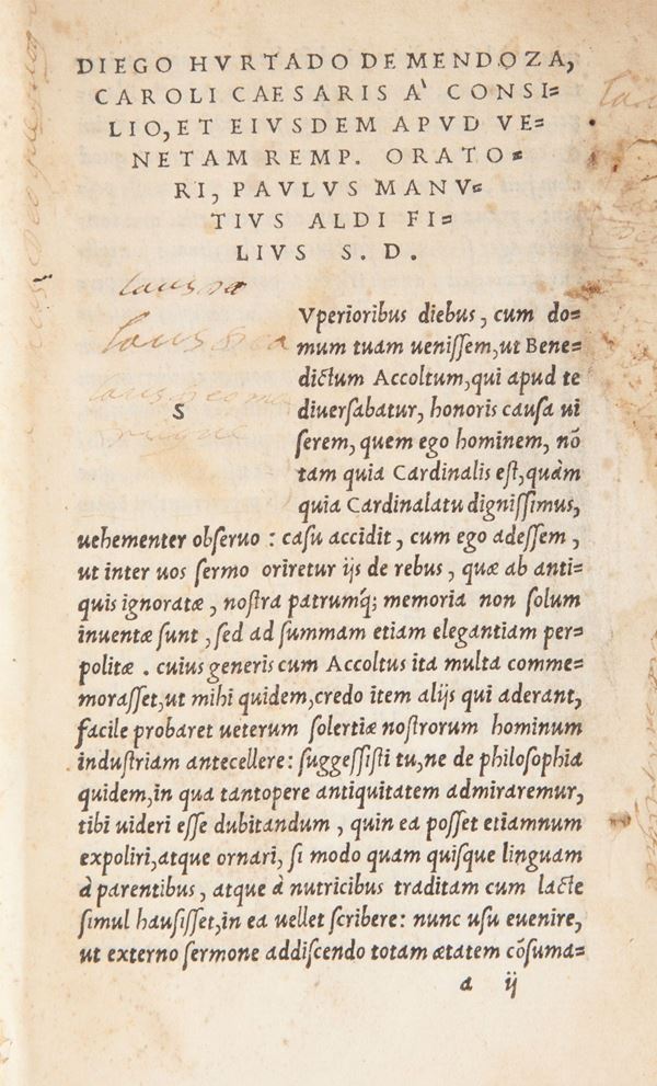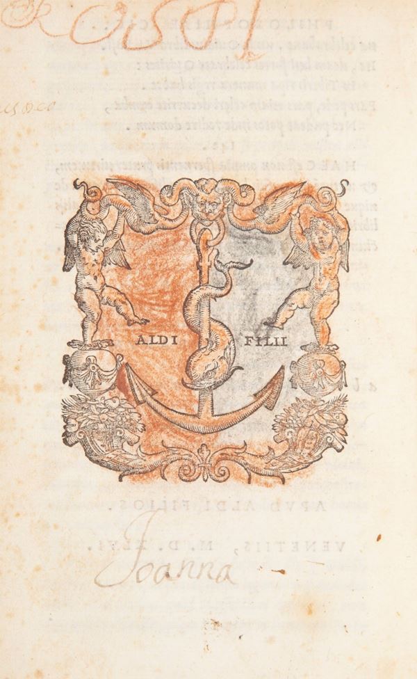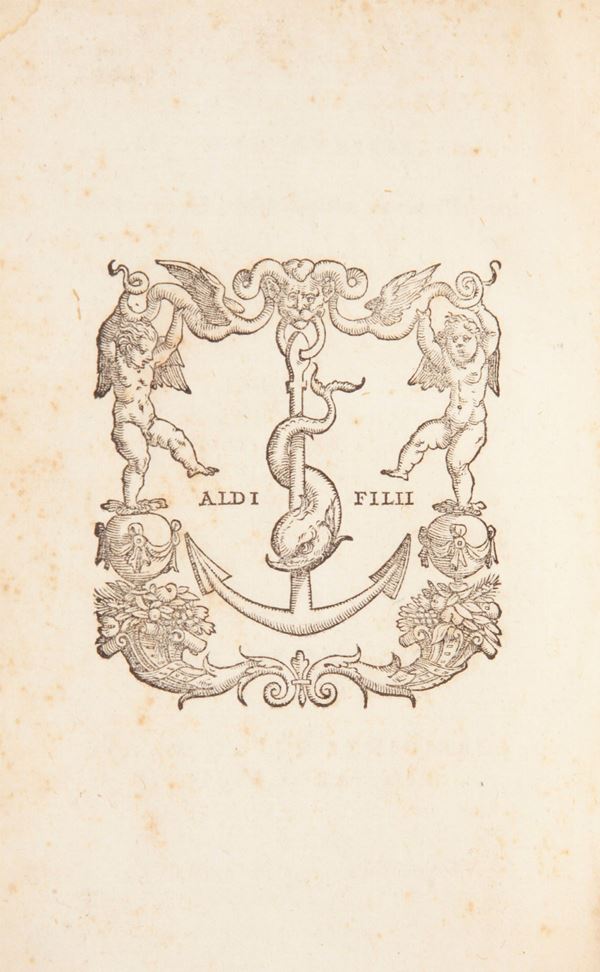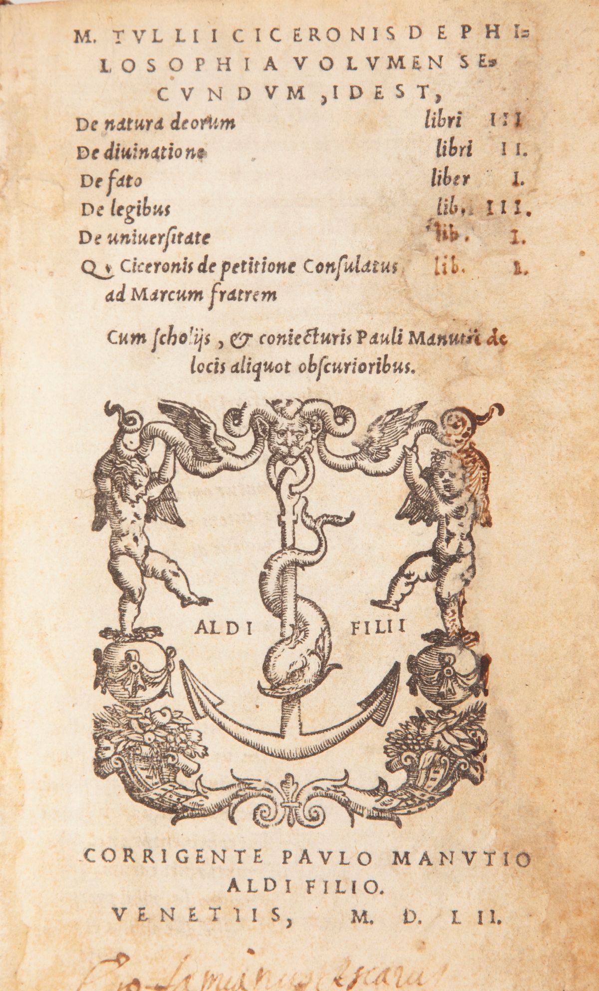 (Aldina) M. Tullii Ciceronis De philosophia, prima pars, id est, academicarum quaestionum editionis primae liber secundus, editionis secundae liber primus, De finibus bonorum & malorum libri V. Tusculanarum quaestionum libri V. Cum scholijs, & coniecturis Paulij Manutij Volumen secundum, id est, De natura deorum lib. III. De divinatione lib. II. De fato lib. I. De legibus lib. III. De universitate lib. I. Q. Ciceronis de Petitione consulatus ad Marcum fratrem lib. I, Paolo Manuzio, Venezia 1546/52