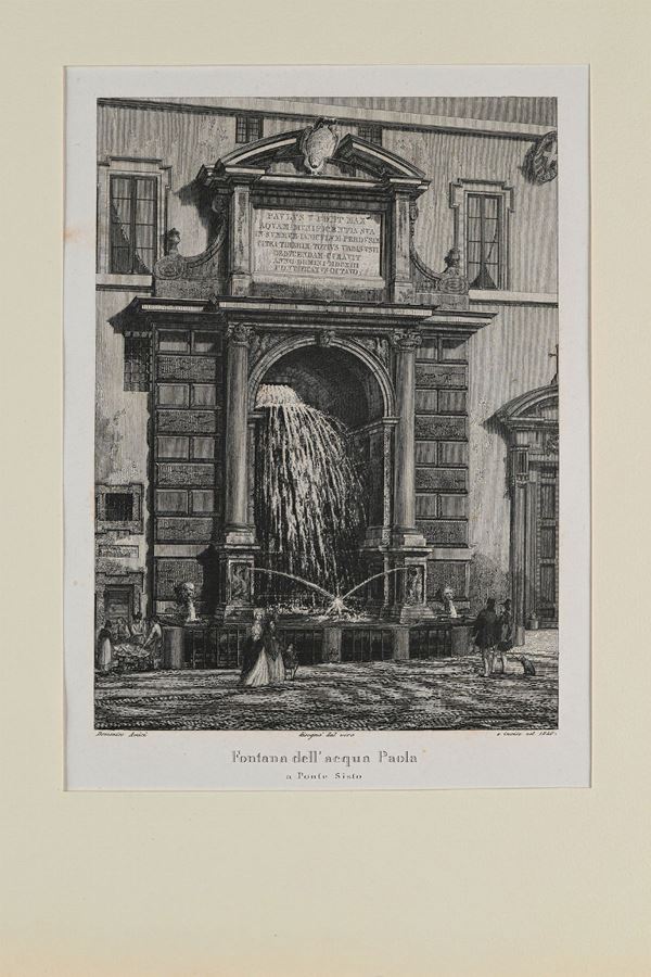 Tratte da: Nuova raccolta dei monumenti antichi dell’alma città di Roma, disegnati dal vero e incisi da Domenico Amici l’anno 1834; Raccolta delle principali vedute di Roma, disegnate dal vero e incise da Domenico Amici Romano, Roma 1835; Raccolta di trenta vedute degli obelischi, scelte fontane e chiostri di Roma, disegnate dal vero ed incise da Domenico Amici, in Roma 1839, presso l’Autore.