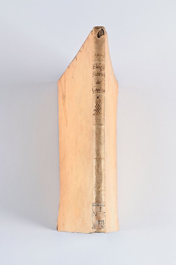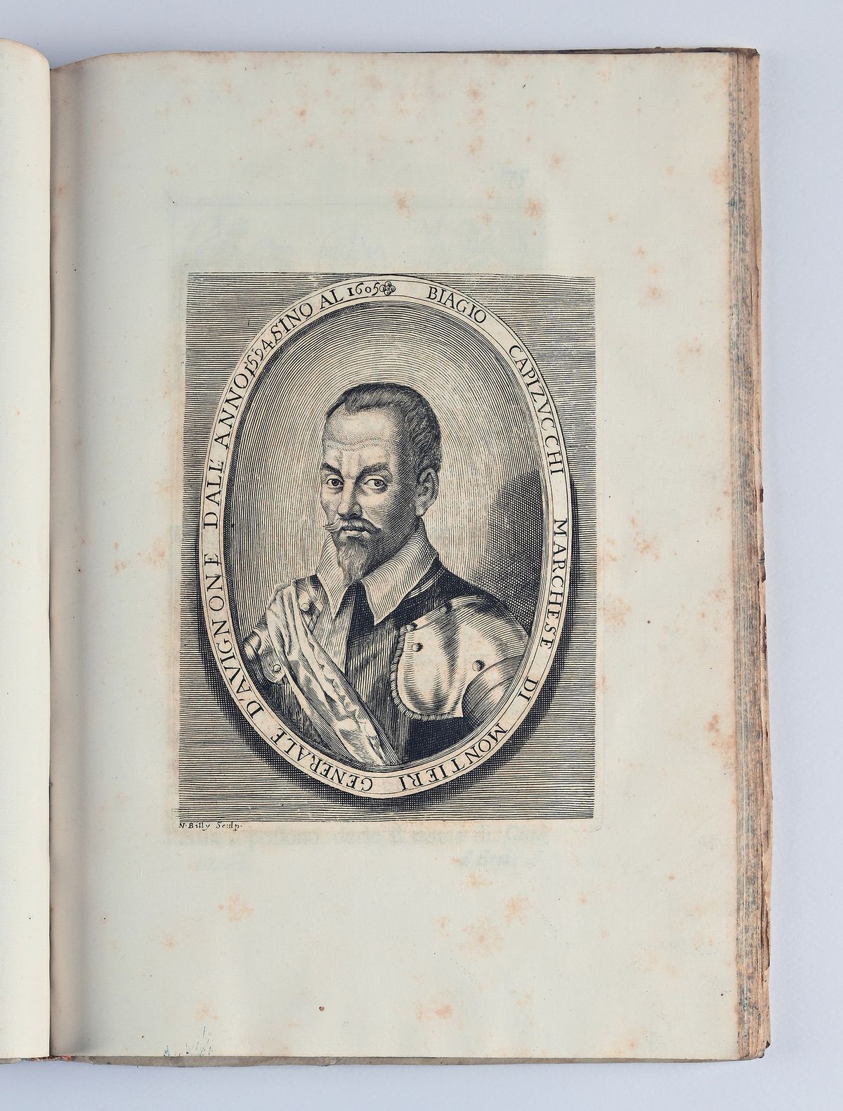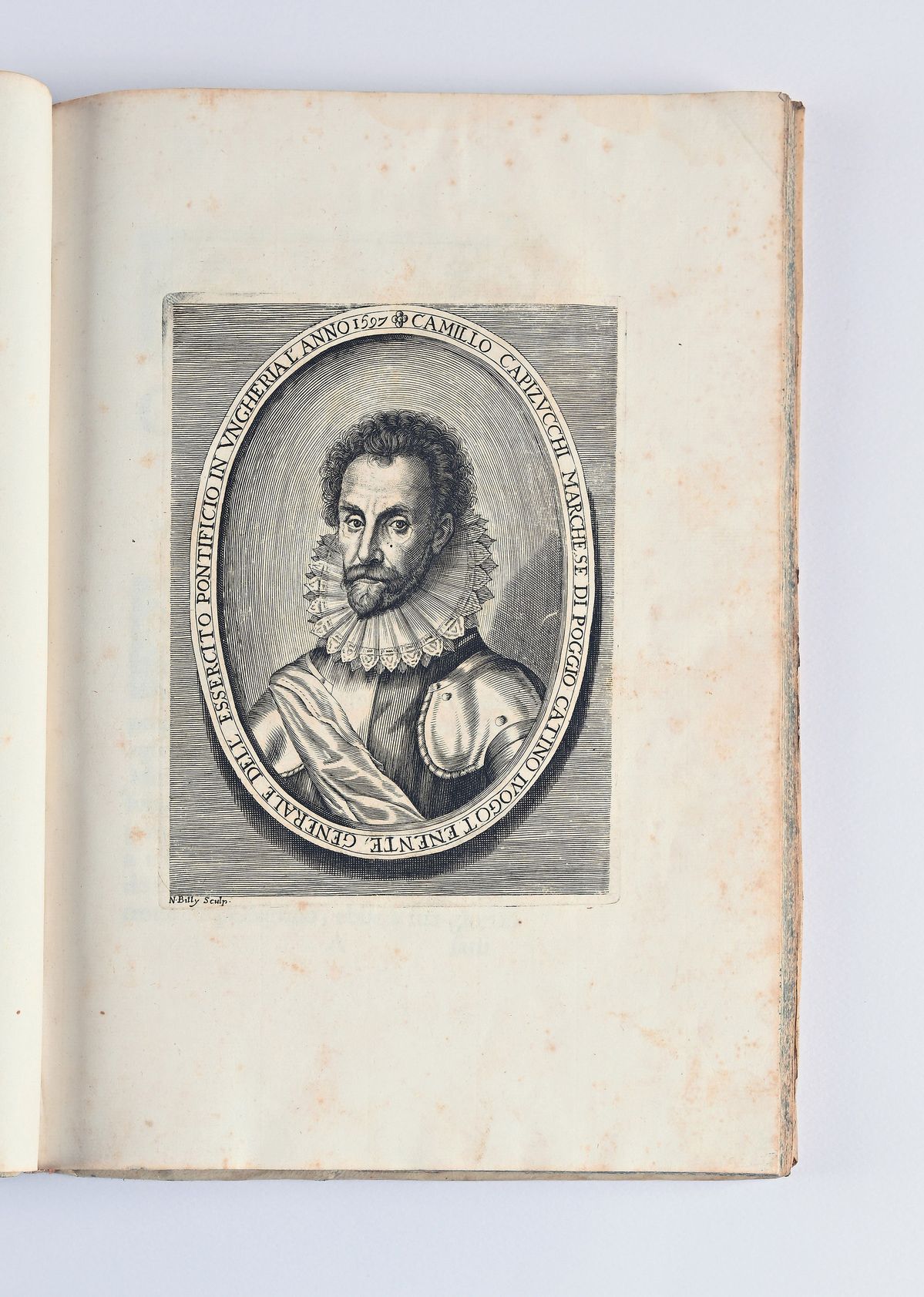 In 2° Edizione originale della biografia dei fratelli Capizucchi opera di Annibale Adami (1626-1706), gesuita del Collegio Romano. Camillo (1537-1597) e Biagio (1546-1619), illustri soldati di ventura che si distinsero in numerosi combattimenti al soldo dei papi, dei Medici, dell'Impero e della Spagna, contro l'Impero Ottomano in Ungheria, a Malta, Lepanto e Cipro e successivamente nelle guerre nelle Fiandre. Illustrato all'inizio della dedicatoria con stemma del casato Capizucchi sorretto da due putti, e con due ritratti in ovale dei fratelli. Legatura coeva in piena pergamena con titolo manoscritto al dorso. Tagli marmorizzati.