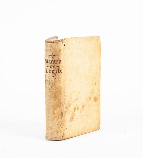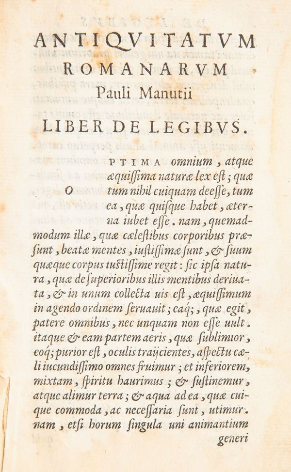 In 8°. Mancante del frontespizio. Celebre opera di Paolo Manuzio figlio di Aldo, stampata in prima edizione a Venezia nel 1557 e concepita in quattro parti sulle Antichità romane. Solo la presente, dedicata alla legislazione, vide la luce prima della morte dell'autore, i "De Senatu", "De Comitiis" e "De Civitate Romana" furono pubblicati solo in seguito. Legatura in piena pergamena settecentesca con titolo manoscritto al dorso. Tagli spruzzati. Esemplare parzialmente slegato con alcune antiche annotazioni manoscritte ai margini di alcune carte. Tracce di gore e macchie, qualche piccolo strappo. Antico restauro che non lede il testo.
