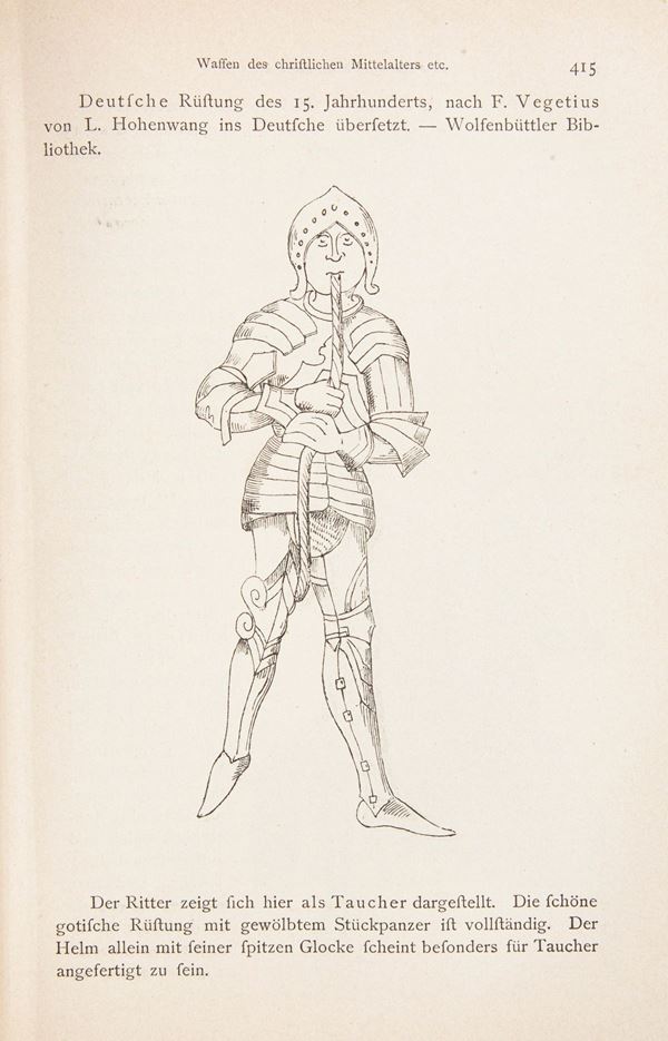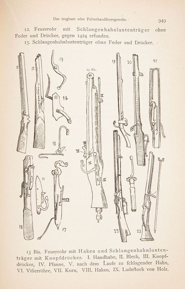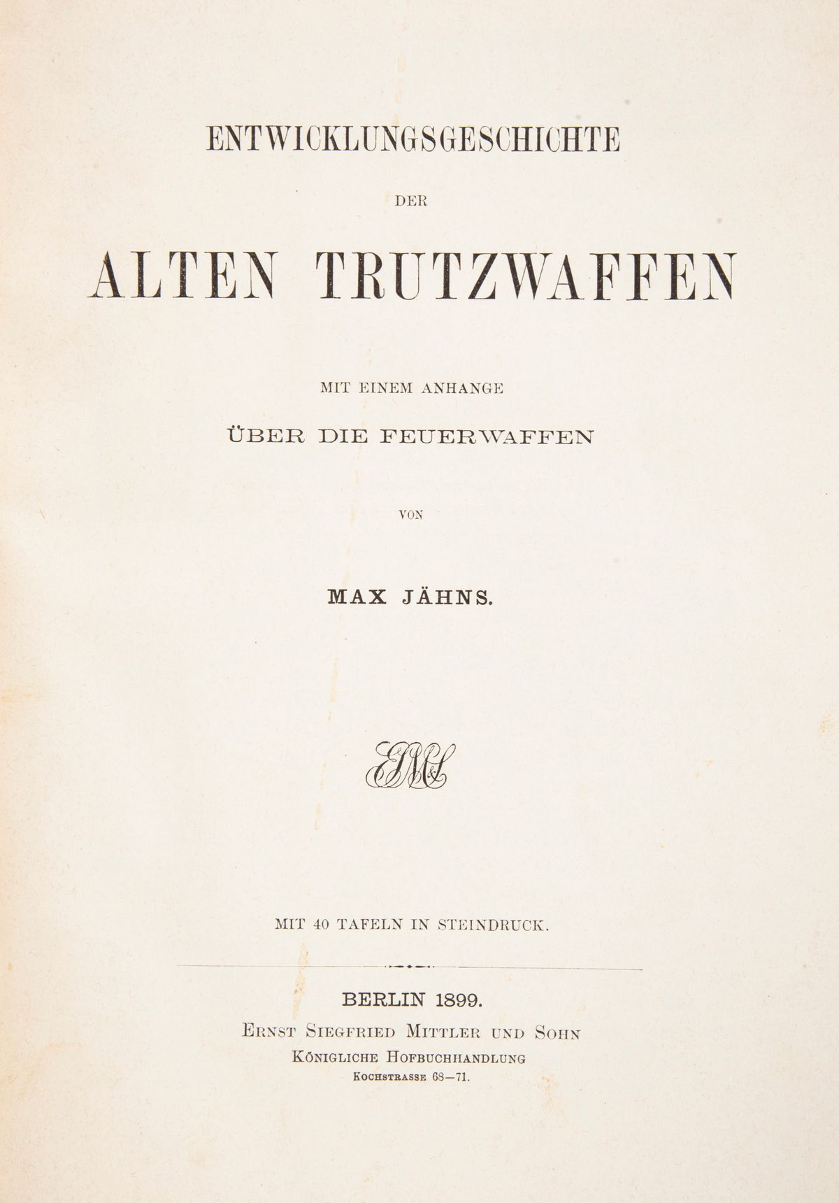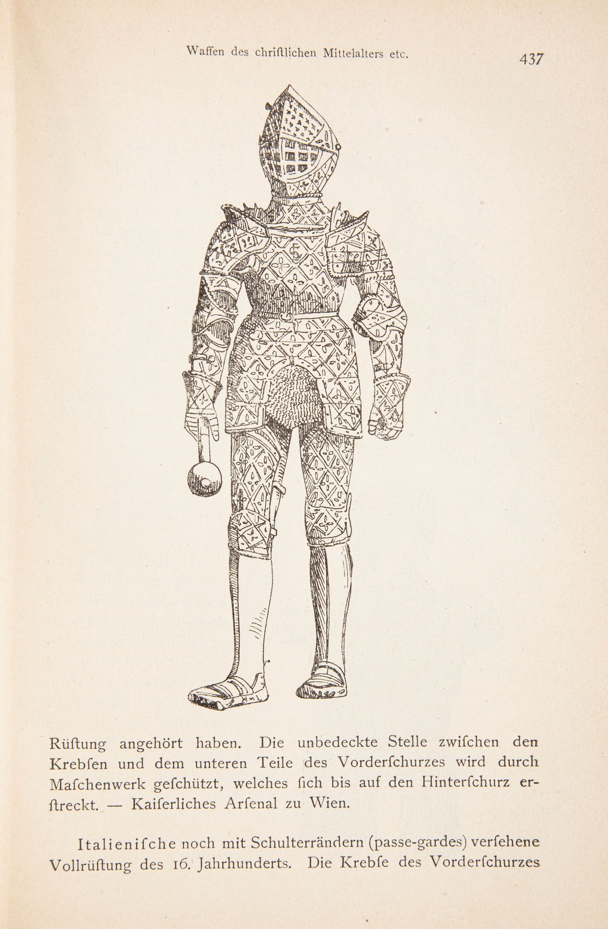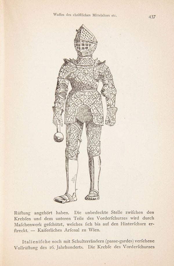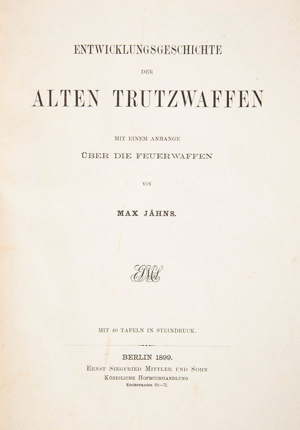 Illustrato con 4.500 immagini di armi e 650 marchi. Legatura editoriale originale illustrata in oro sul dorso e sul piatto. Insieme nel lotto: Max Jahns - Entwicklungsgeschichte der Alten Trutzwaffen. Mit einem anhange uber die Feurwaffen, Mittler und Sohn, Berlino 1899.