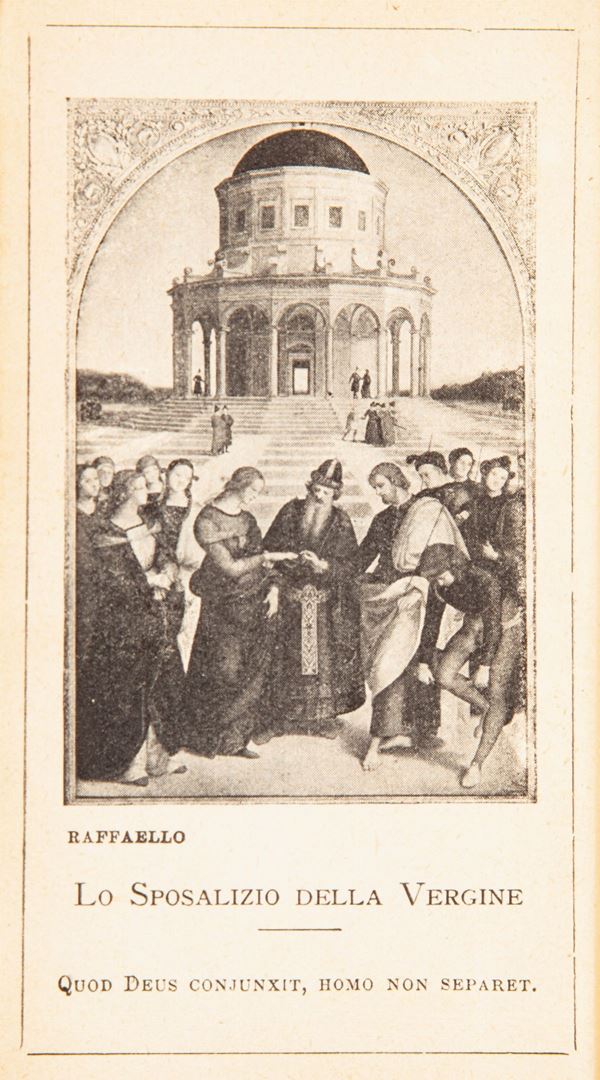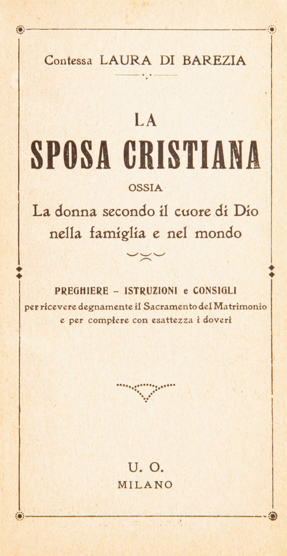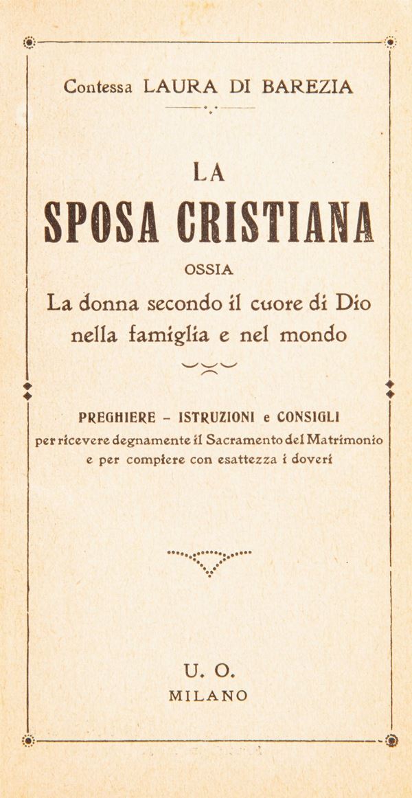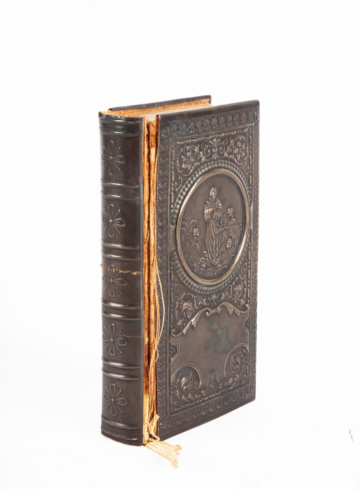 Bella legatura degli inizi del XX secolo in argento 800/000 cesellata a sbalzo a motivi floreali con tondo raffigurante la Madonna in cielo - Laura di Barezia, La sposa cristiana, Bietti Milano 1911