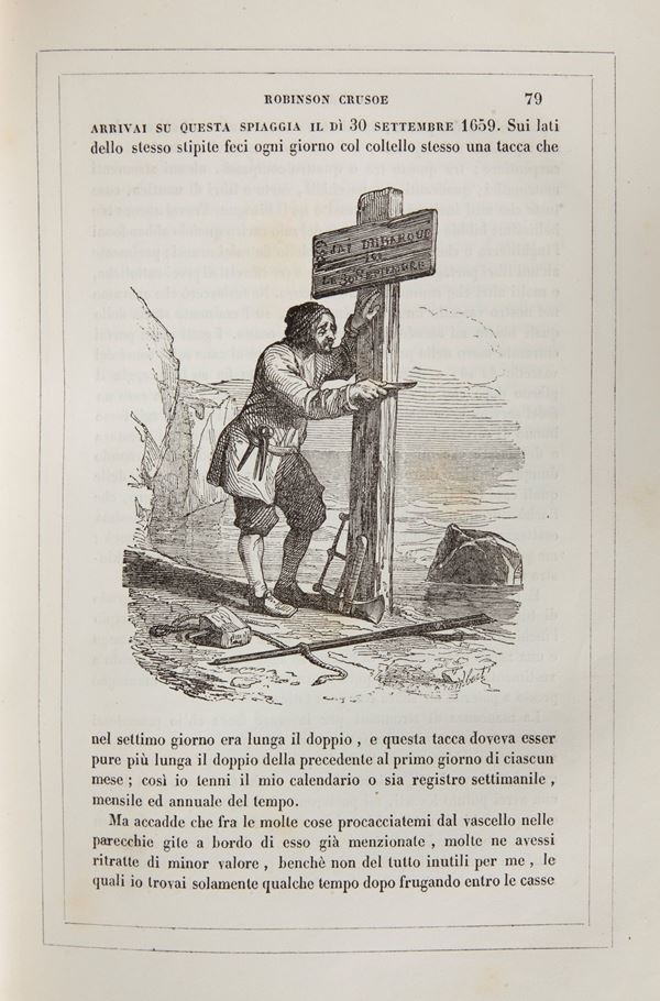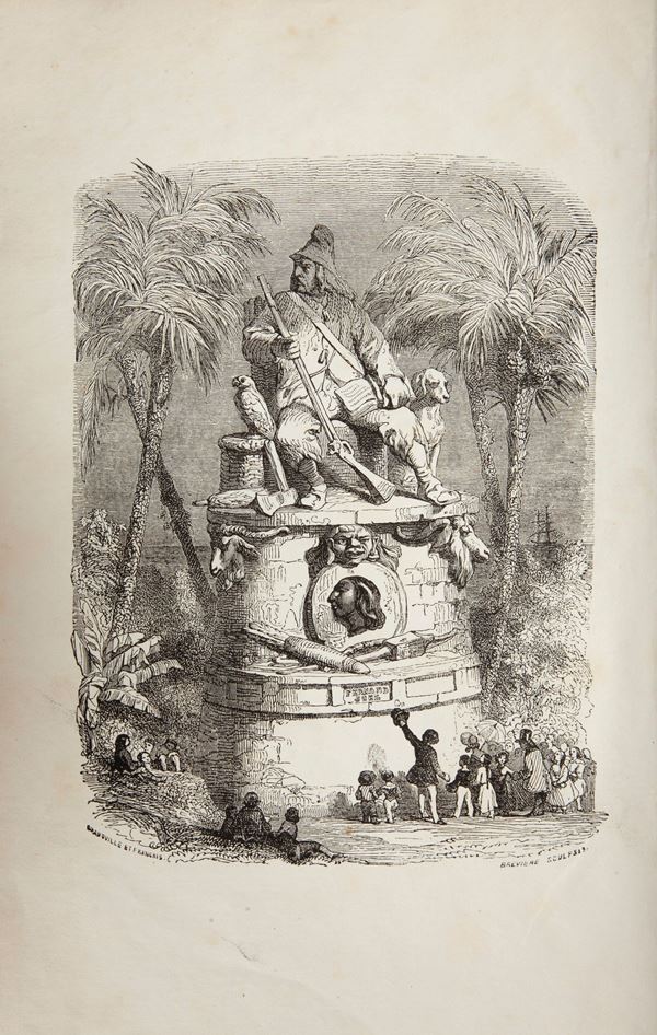 In 4°. Edizione ottocentesca illustrata con antiporta figurato di Grandville e con 40 tavole a piena pagina fuori testo e 206 figure nel testo di un capolavoro del romanzo d'avventura. Legatura coeva in mezza pelle con fregi in oro e tassello con titolo in oro al dorso.