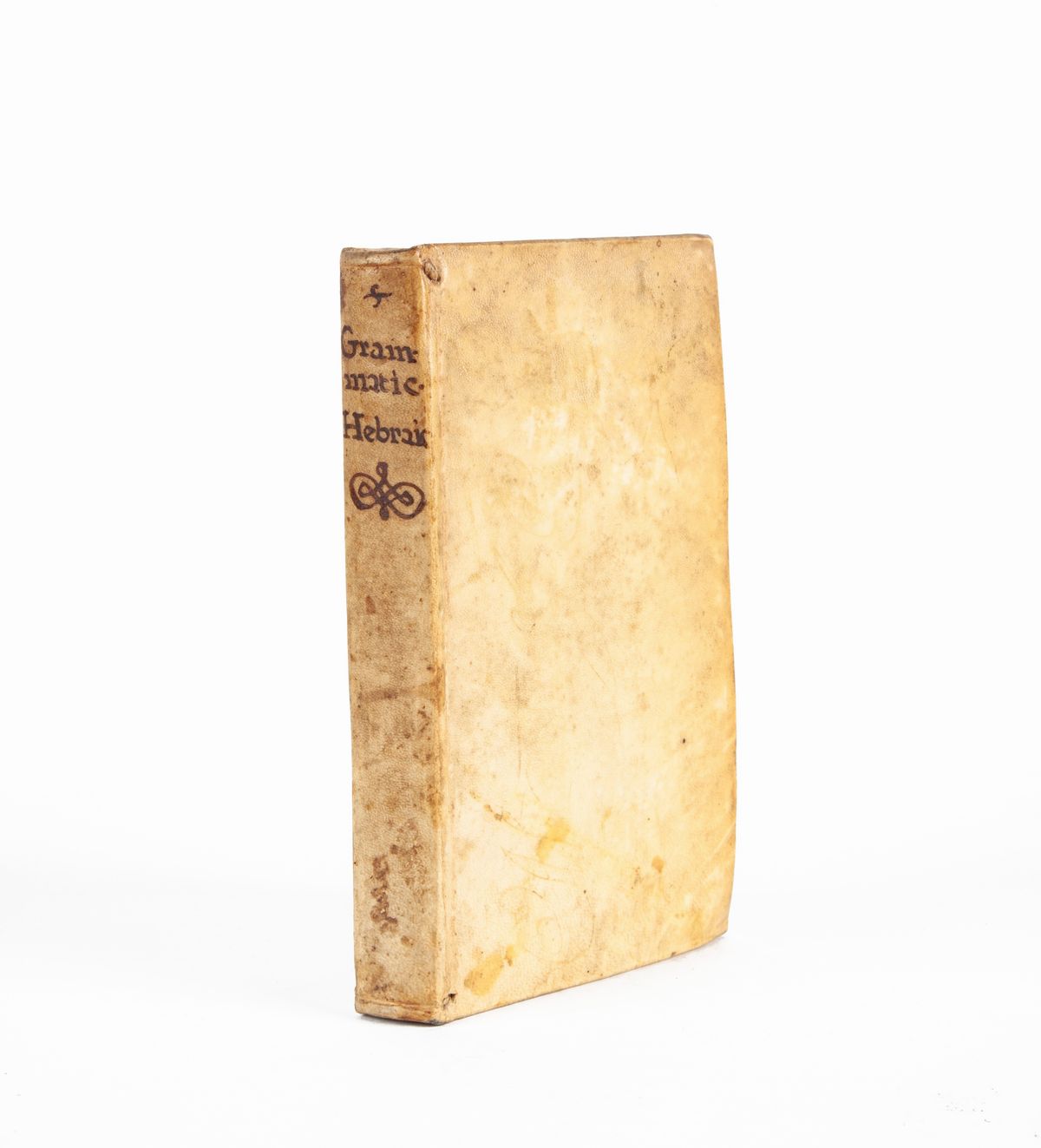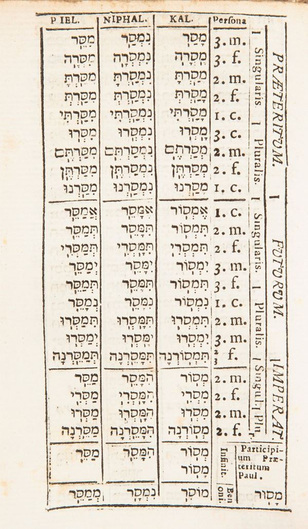 In 16°. Prima edizione stampata in Italia di questa grammatica ebraica, scritta dal gesuita inglese Edward Slaughter (1655-1729), docente di ebraico e matematica a Liegi, poi rettore del Collegio, pubblicata in edizione originale ad Amsterdam nel 1699. Quest'edizione romana del 1705 è nota per essere presente fra le grammatiche ebraiche nella biblioteca di casa Leopardi. Non è dato sapere quale fosse il livello di conoscenza raggiunto dal giovane Leopardi nell'ebraico, mentre sappiamo quanto la conoscenza del greco gli consentisse di destreggiarsi nei complicati meandri della filologia e dell'erudizione. Legatura in piena pergamena rigida con titolo manoscritto al dorso e tagli spruzzati.