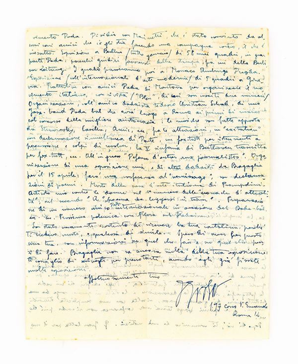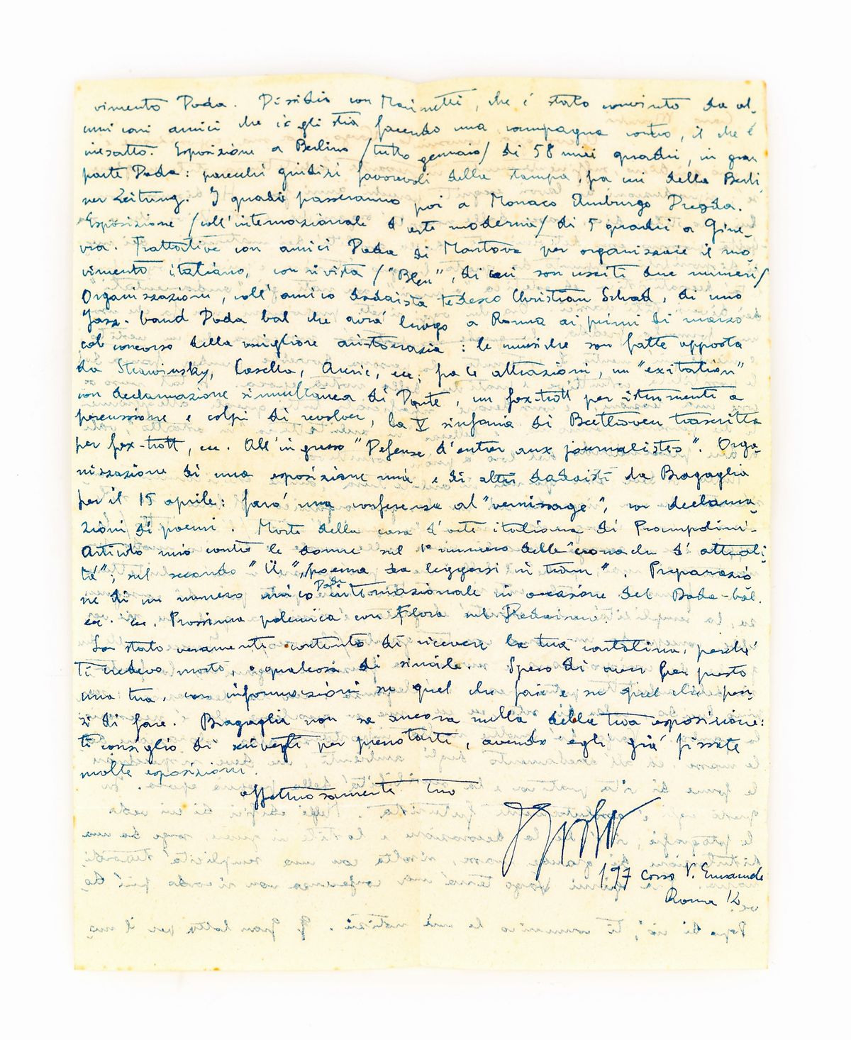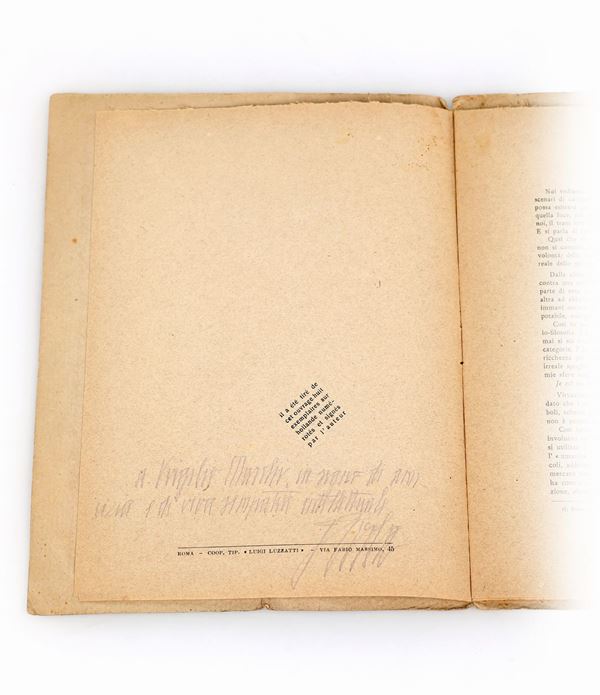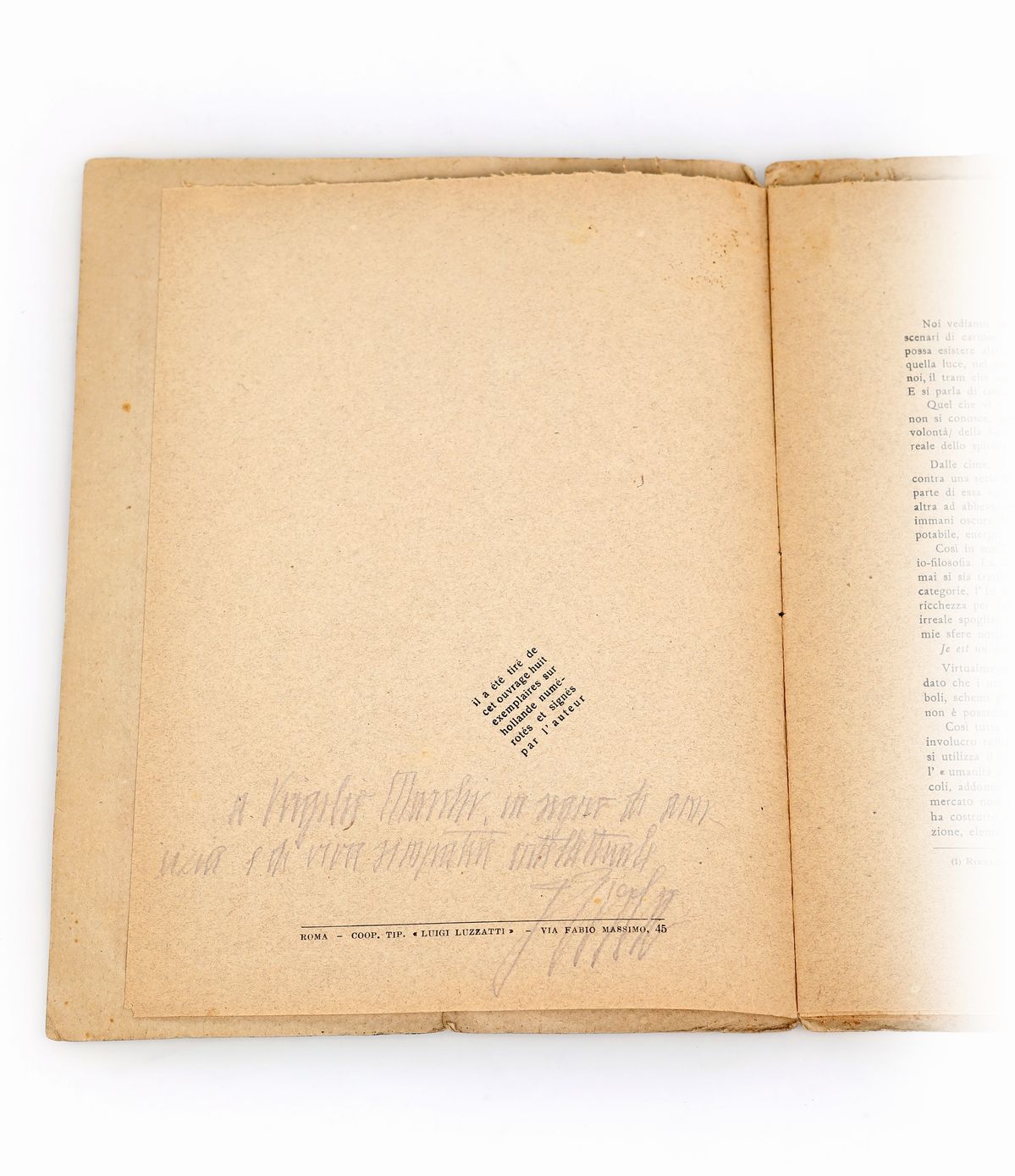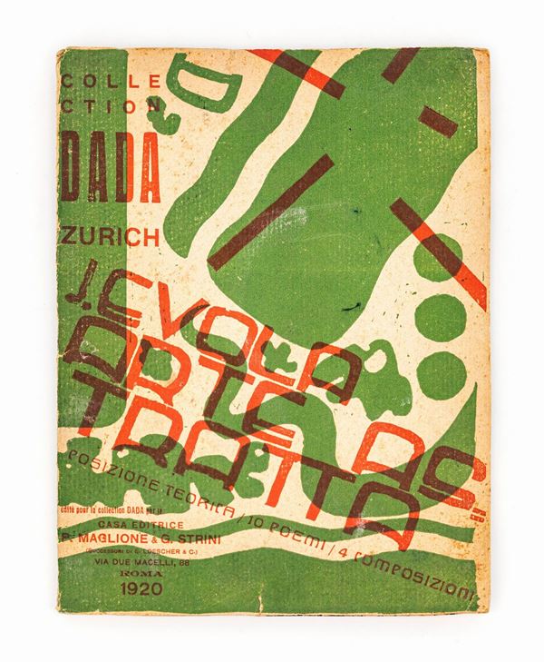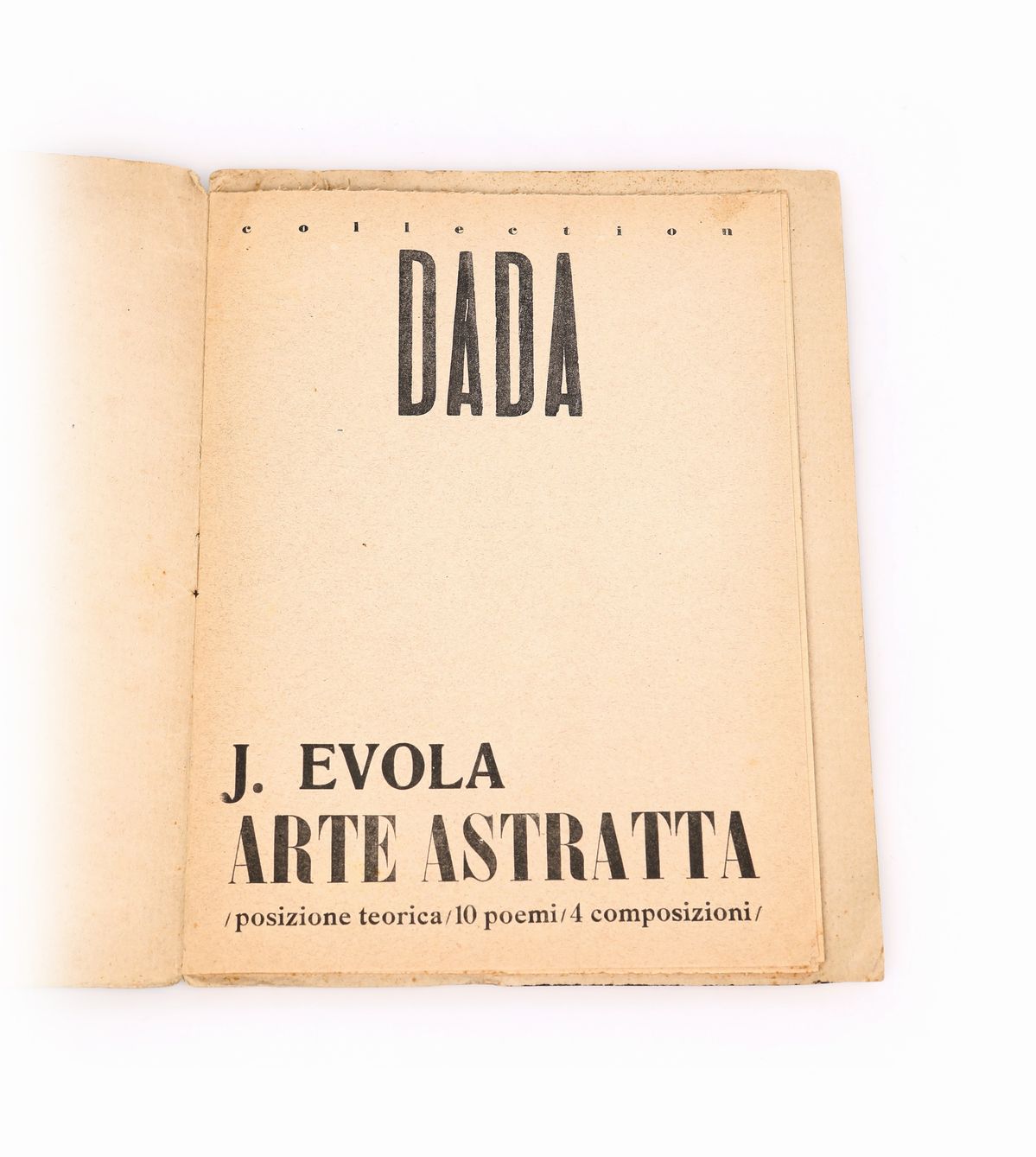 24 pp. Volume originale dell'opera di Evola di adesione al Dadaismo. Noto oggi più come ideologo fascista e simpatizzante di alcuni aspetti del nazismo che come teorico dell'arte e artista, fu invece oltre che filosofo e scrittore anche un valente pittore e poeta. Dopo una prima adesione al futurismo che abbandonò presto, dopo la guerra trascorsa sul Piano di Asiago nel 1917-18 come ufficiale di artiglieria, si interessò al Dadaismo entrando in contatto epistolare con Tristan Tzara, fondatore del Dadaismo. Dedica del volume e lettera allegata indirizzata al pittore ed architetto Virgilio Marchi, esponente di spicco del Secondo Futurismo nonché uno dei maggiori scenografi italiani. Avvicinatosi giovanissimo al movimento futurista, amico di Marinetti per il quale progettò la villa di Capri nel 1927. Copertine originali illustrate in cartonato.