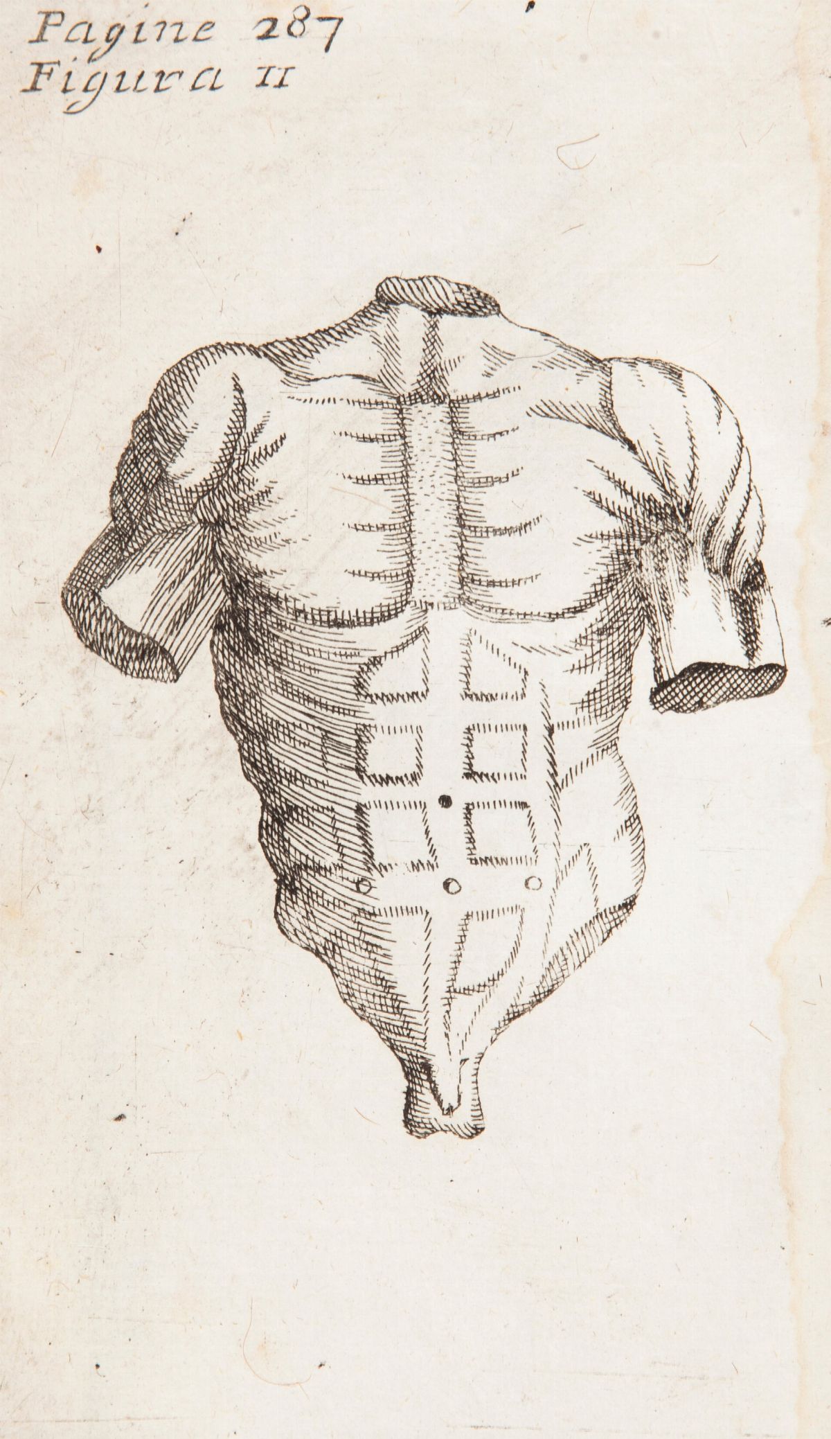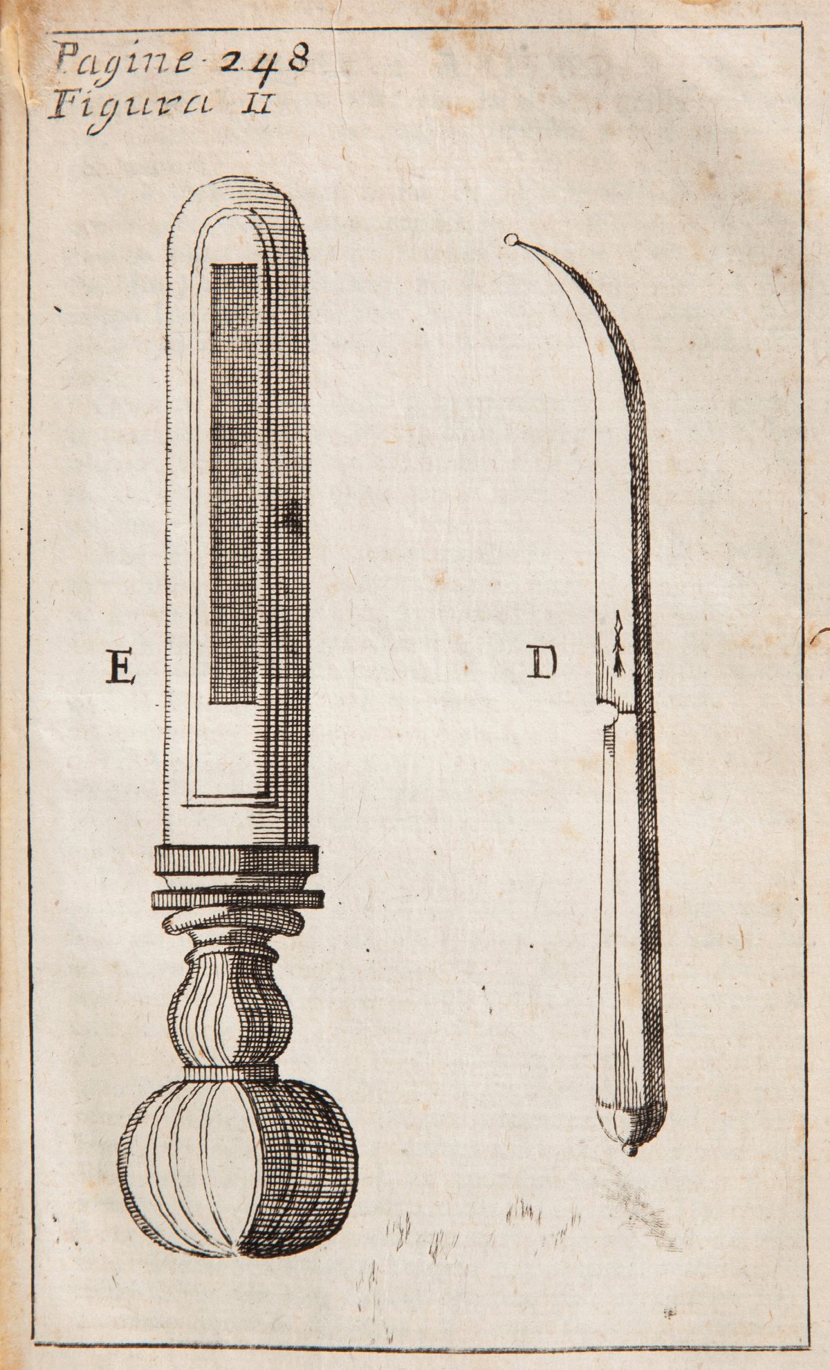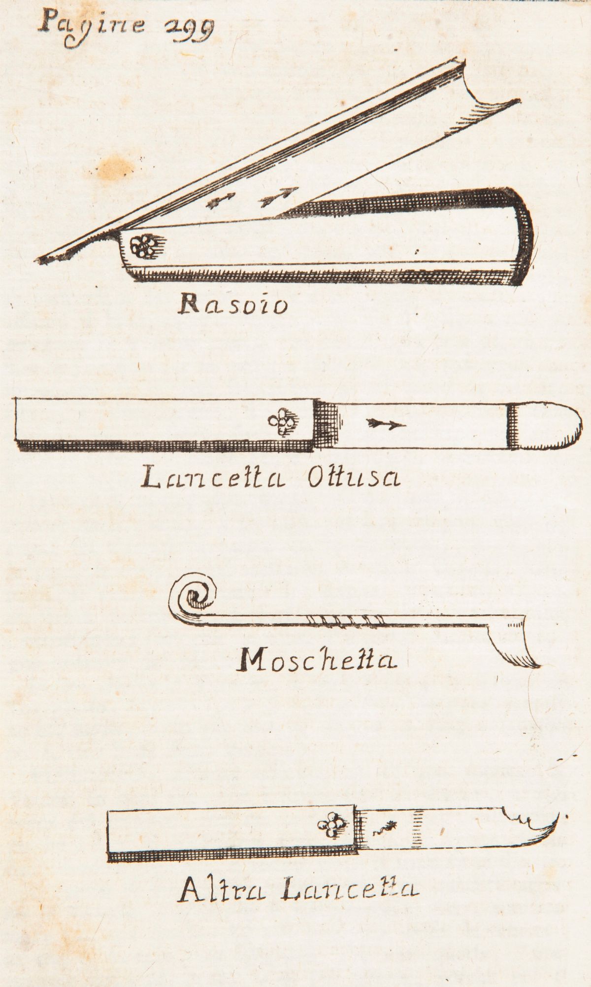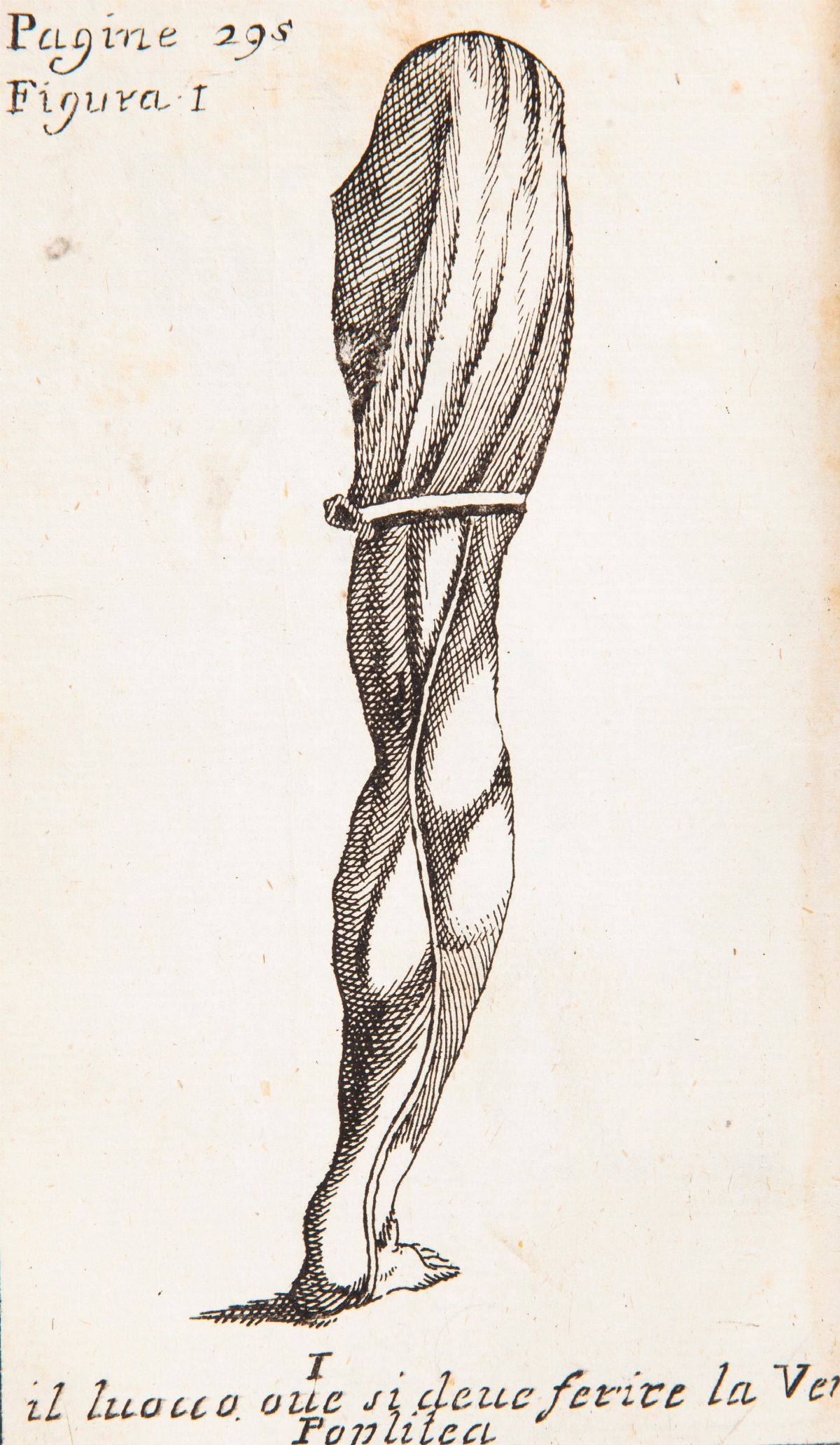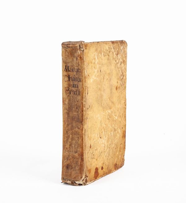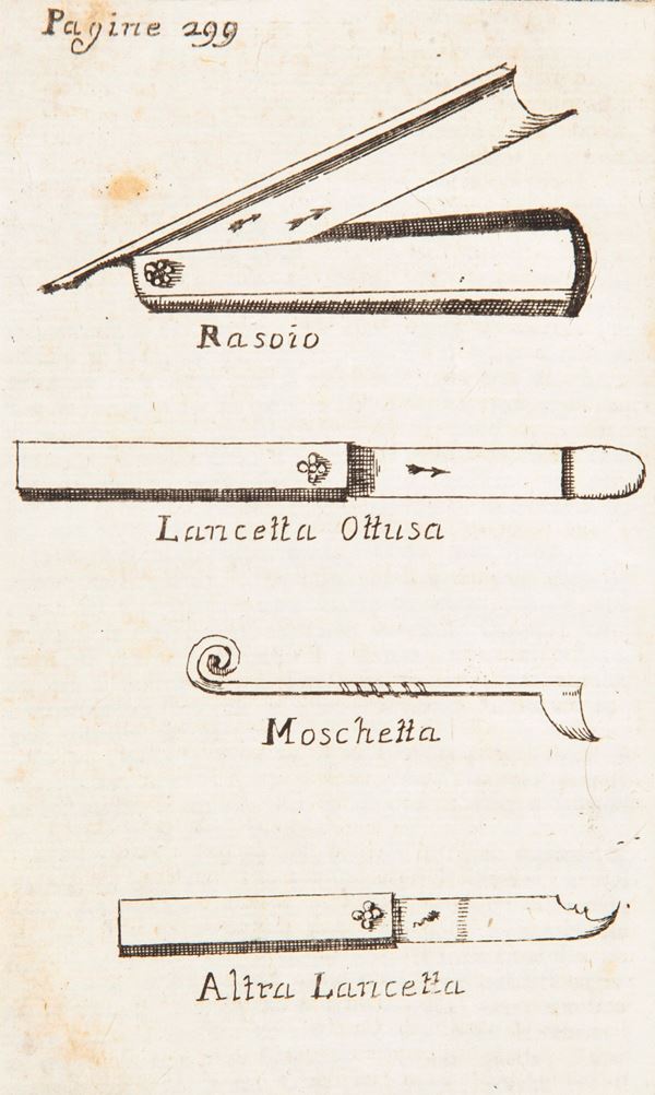 In 8°. Edizione sesta di quest'opera del medico padovano primo Chirurgo del Pio Ospitale di San Francesco Grande di Padova. Presenti numerose illustrazioni xilografiche a piena pagina che raffigurano parti anatomiche e strumenti chirurgici, tecniche pratiche per mettere dei punti di sutura, curare amputazioni, ernie, fratture. La chirurgia nasce come lavoro manuale, esercitata dal medico ippocratico e poi, a partire dal Medioevo, dal barbiere in bottega o dal cerusico sui campi di battaglia. Appresa non attraverso i libri ma per imitazione e ripetizione dei gesti, la chirurgia è via via cresciuta da quando l'esercitazione anatomica ha creato le premesse scientifiche per una operazione efficace sul corpo dei vivi. A partire dal Sei e nel Settecento numerose opere di divulgazione, tra cui questa, hanno consentito di istruire i chirurghi alla pratica della professione. Legatura in piena pergamena coeva con titolo manoscritto al dorso. Gore d'acqua e bruniture che ledono solo marginalmente il testo.