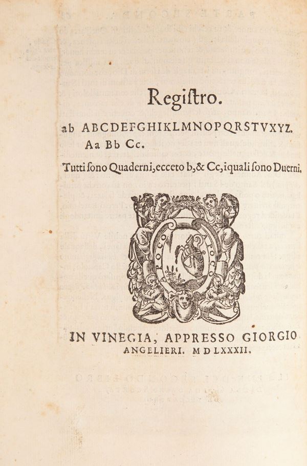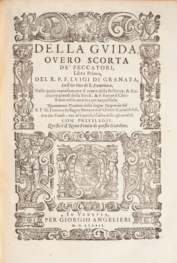 In 4° La prima opera fa parte di La Prima (Quarta) parte dell'Oratione et Meditatione per li giorni della settimana, & per altro tempo, del R.P.F. Luigi di Granata dell'Ordine de' Predicatori. Opera del celebre teologo e frate domenicano spagnolo, al secolo Luis de Sarria (1504-1588), Grande inquisitore di Spagna, predicatore di prestigio altamente riconosciuto. Legato assieme ad altre 2 opere del frate spagnolo con stesse marche tipografiche, editore, luogo e date di stampa. Legatura in mezza pergamena con angoli del XIX secolo. Tagli rubricati.