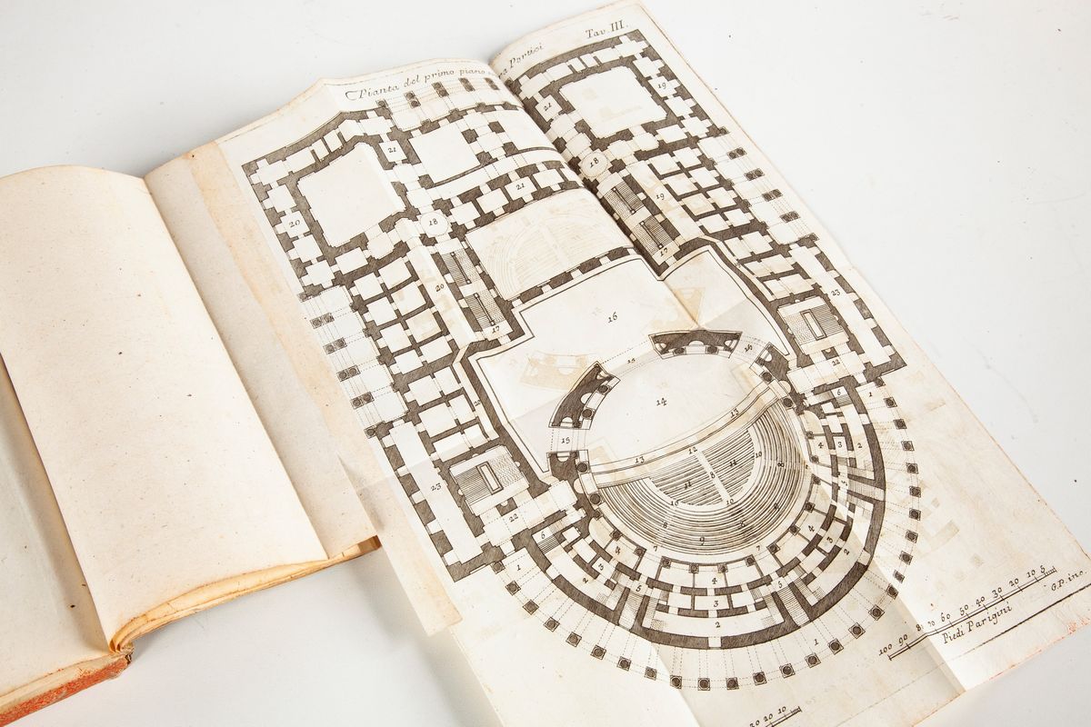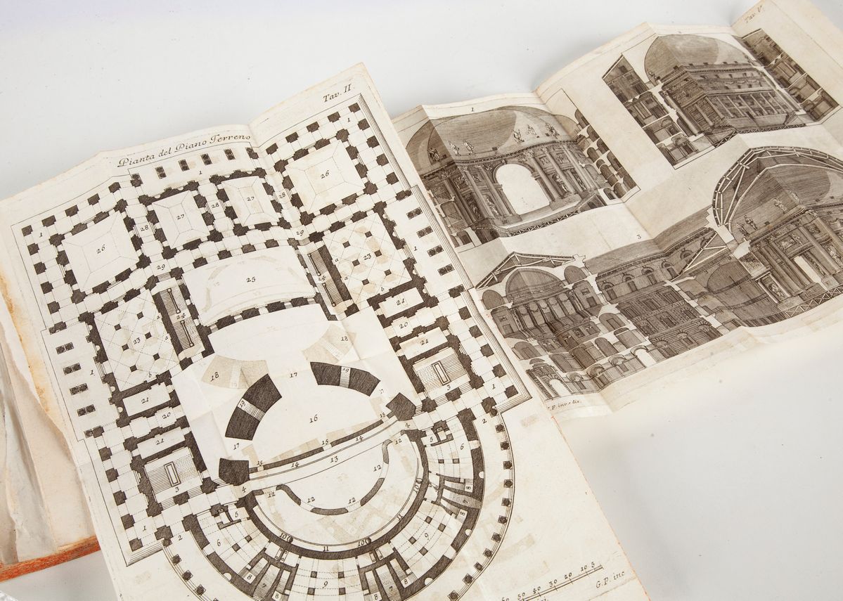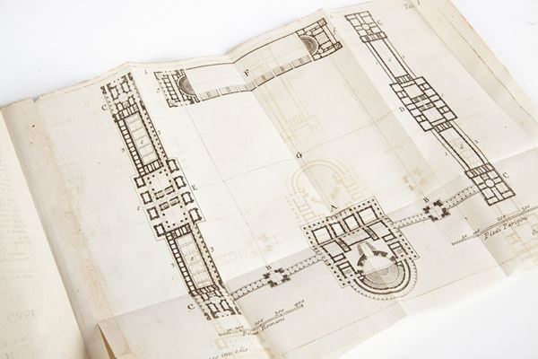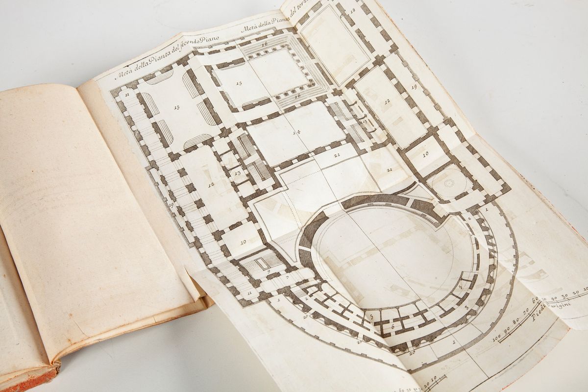 Opera rarissima, pubblicata anonima. Corredata di 6 tavole in folio più volte ripiegate raffiguranti piante, spaccati ed un intero edificio del "Teatro ideale", incise in rame da Giuseppe Petroschi e disegnate da Vincenzo Ferraresi. Prima edizione (pubblicata a Roma il 25 dicembre 1771 ma con data 1772) le cui copie furono per la maggior parte sequestrate e distrutte. La maggior parte del libro non versa sul teatro materiale mentre invece sviluppa una serie di idee politiche, critiche e letterarie, oggetto di forte censura, che in Italia facevano paura a quel tempo e che caratterizzano l'autore come un pensatore tra i più validi ed indipendenti del secolo XVIII. Per il nome dell'Autore (Francesco Milizia), cfr. Melzi, Anonime e pseudonime, III, p. 129. Esemplare privo di legatura. Tagli spruzzati.