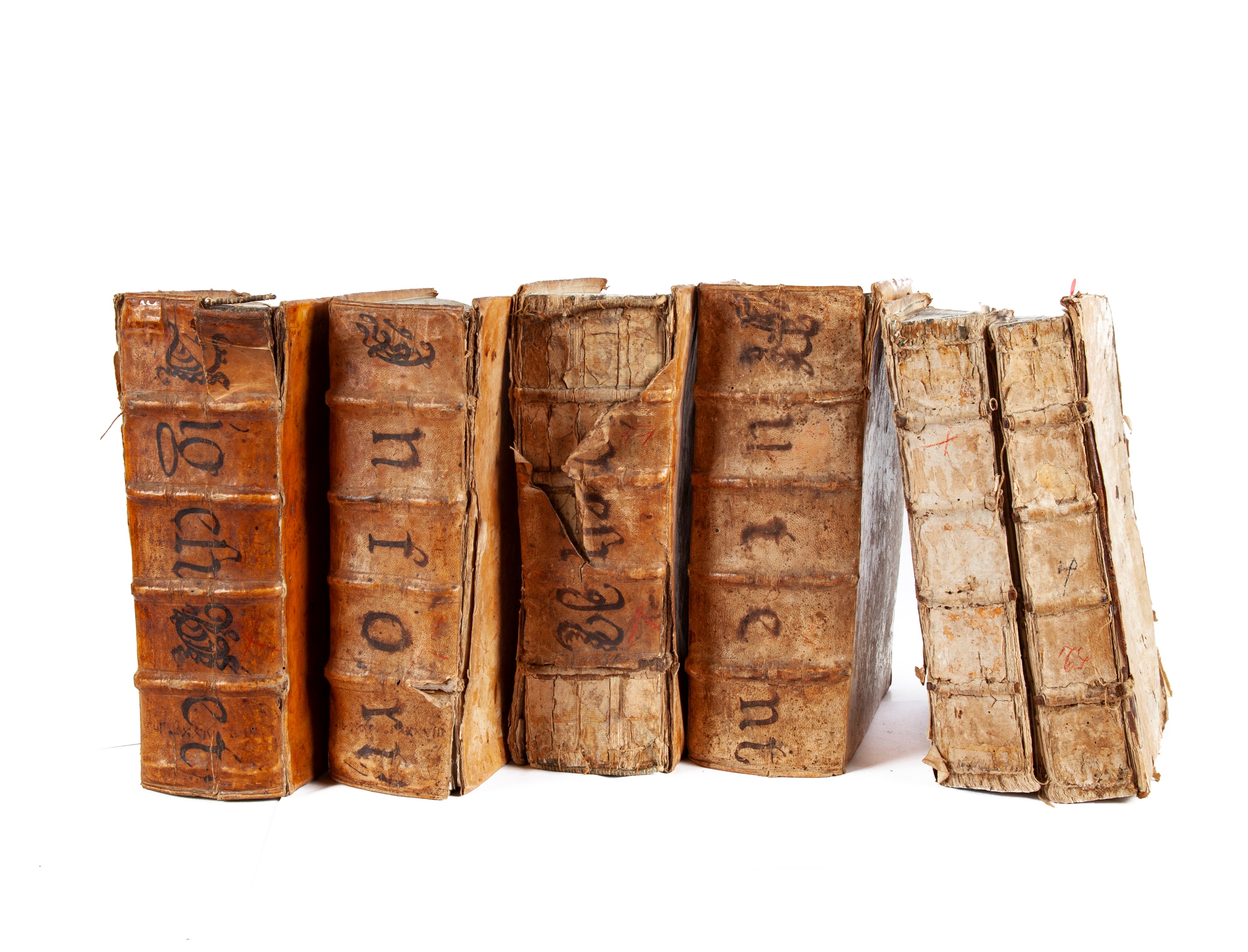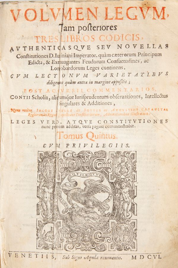 In 4°. 5 Volumi. Testo su 2 colonne numerate con note a lato e al margine. Importante edizione veneziana di primo seicento del Corpus giustinianeo: nella composizione princeps il Corpus Iuris civilis, detto vetus perché è il primo a essere stato ricomposto, comprende i libri 1-24.2 del Digesto giustinianeo, gli altri volumi sono l'Infortiatum (libri 24.3-38), il Digestum novum (libri 39-50), il Codex (libri 1-9) e il Volumen parvum (comprendente le Istitutiones, i Tres libri finali del Codex e le Novellae). Legatura in piena pergamena coeva a 4 nervi con titoli manoscritti ai dorsi. Tagli di colore blu. Difetti alle pergamene. Il IV Volume è parzialmente slegato e privo del rivestimento in pergamena della legatura. Gore e macchie sparse e segni di tarlo sparsi su più volumi.