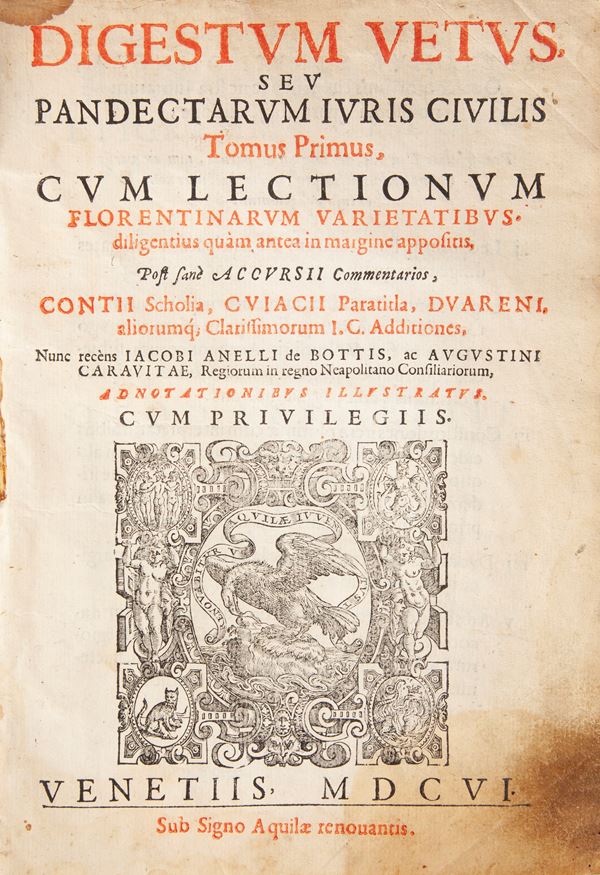 Giustiniano Imperatore - Digestum Vetus seu Pandectarum Iuris Civilis cum lectionum florentinarum varietatibus diligentius quam antea in margine appositis post Accursii Commentarios Contii Scholia Cuiacii Paratitla Duareni aliorumq Clarissimorum I.C. Additiones, Sub signo Aquilae, Venezia 1606