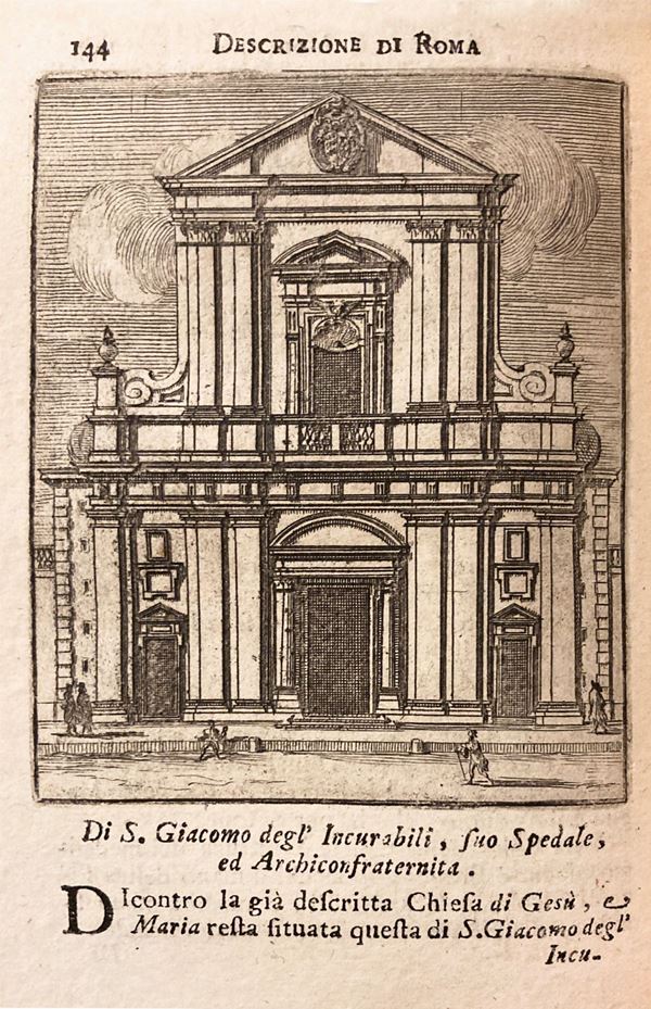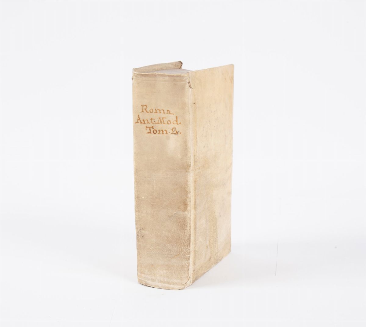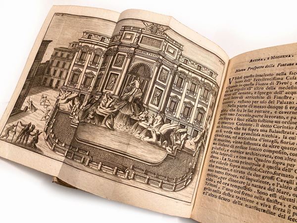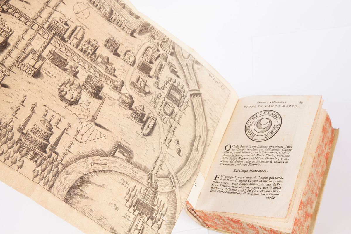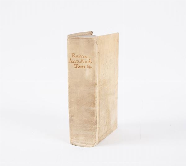In 8° Illustrata con numerose incisioni in tavole più volte ripiegate e nel testo, raffiguranti piante della città, vedute, monumenti e monete. Edizione accresciuta ed abbellita da tavole in rame di questa guida di Roma approntata per l'anno santo del 1750 opera del Mercante di libri in Piazza Navona Roisecco. Legatura coeva in piena pergamena con titolo manoscritto al dorso. Tagli marmorizzati.