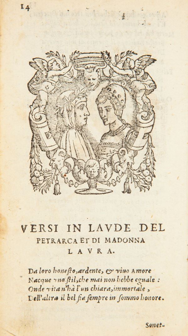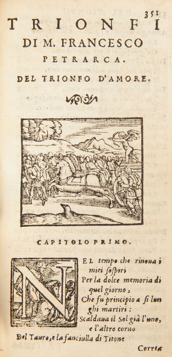 Ristampa dell'edizione del 1562 illustrata nel testo con un ritratto del Petrarca e Laura ed una vignetta incisa su legno all'inizio di ciascun Trionfo. Unito Segue: Tavola di tutte le rime de i Sonetti e Canzoni del Petrarca. Due parti rilegate in un volume in 12°; pp.490; 259,3n.nn. con registro ed insegna tipografica. Legatura in piena pergamena coeva con titolo manoscritto al dorso (parzialmente slegato). Antiche sottolineature e note manoscritte ad inchiostro.