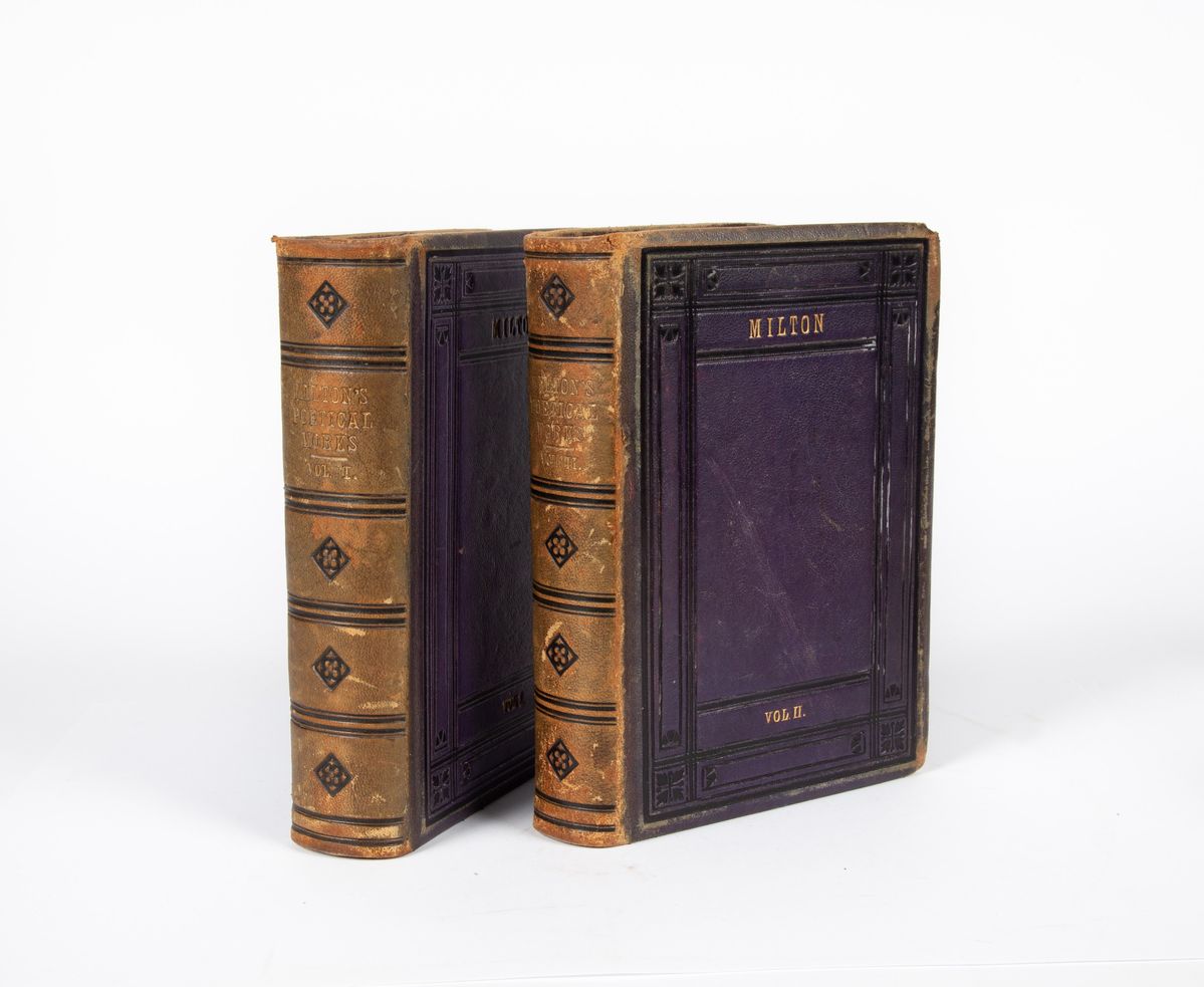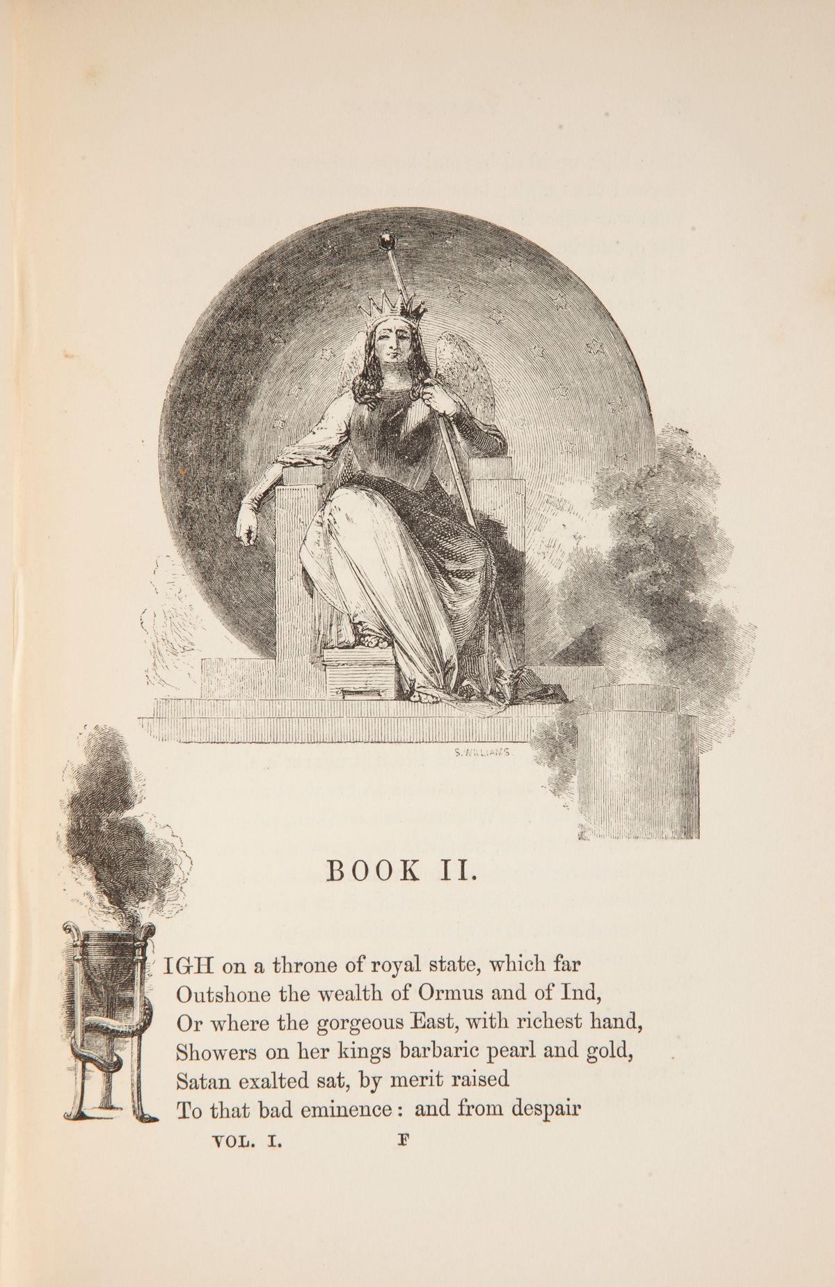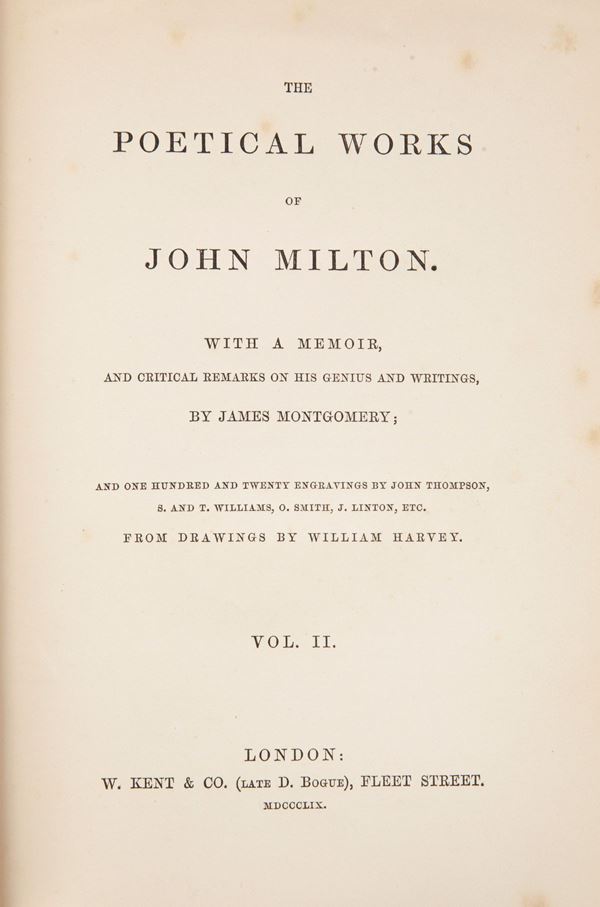 In 8° Opera in due volumi, con 120 illustrazioni di John Thompson, S. e T. Williams, O. Smith, J. Linton su disegni di William Harvey della raccolta poetica del celebre poeta, scrittore, filosofo e statista britannico del Seicento, autore di Paradiso Perduto. Pregevoli legature in piena pelle con fregi incisi sui piatti e con titoli in oro a dorsi e ai piatti anteriori. Tagli dorati.