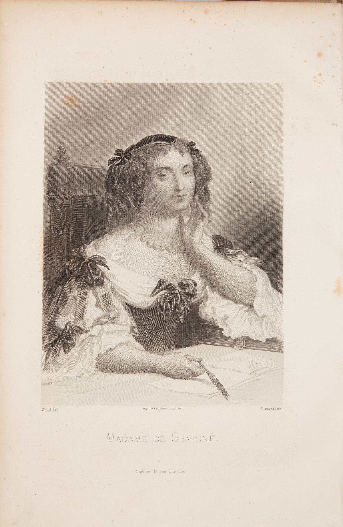 in 4°. Edizione illustrata con 13 ritratti di Staal fuori testo incisi da Girardet, Massard, Delannoy, Regnault, Outhwaite. Antologia illustrata della ricca corrispondenza privata composta da oltre mille lettere della celebre letterata francese del Seicento. Lettere indirizzate in circa trent'anni alla figlia Françoise de Grignan, nelle quali l'autrice racconta della vita alla corte francese al tempo del Re Sole (Luigi XIV) e degli avvenimenti più importanti del suo tempo, dando uno spaccato della società del tempo. Legatura novecentesca in mezza pergamena con titolo in oro al dorso.