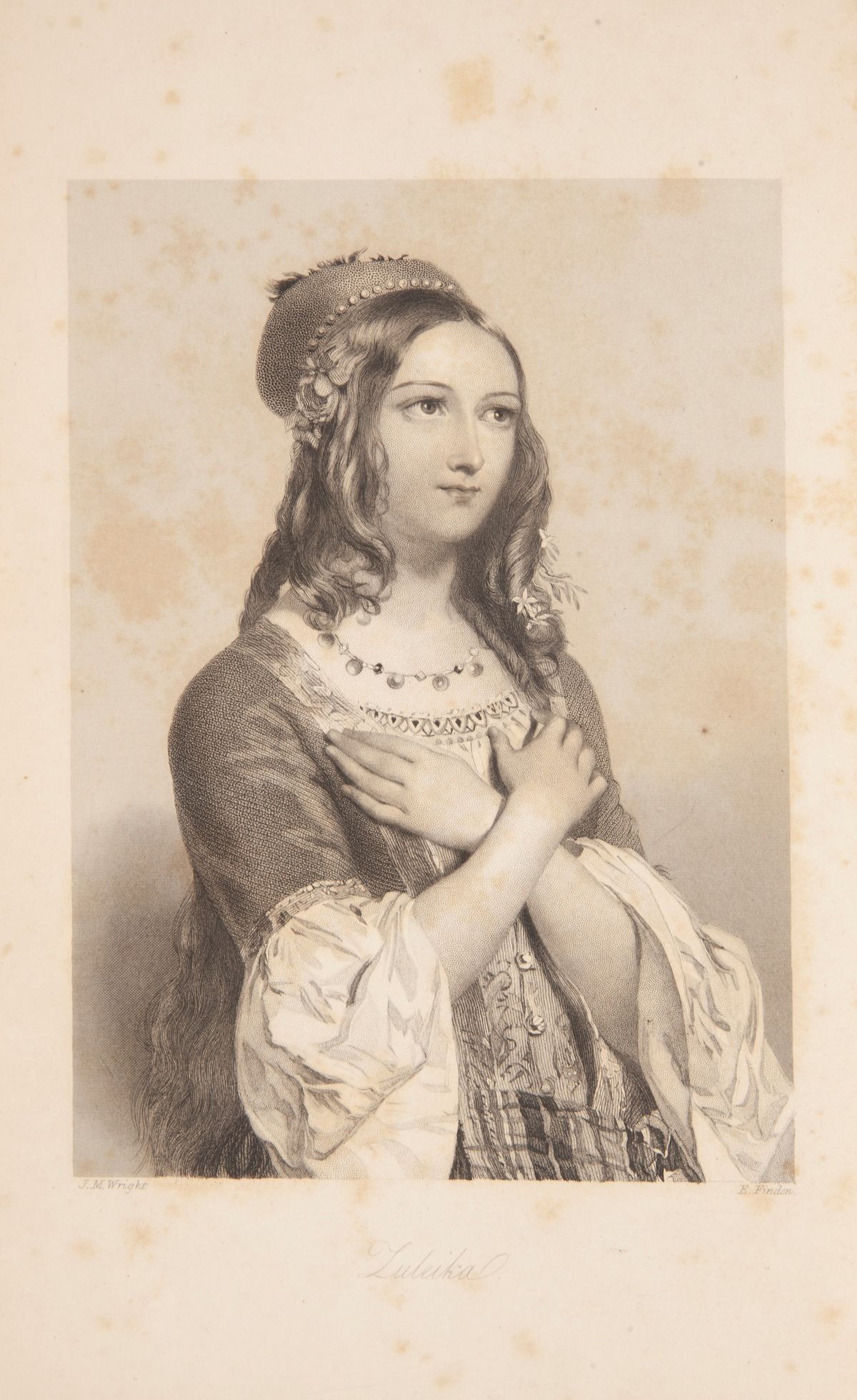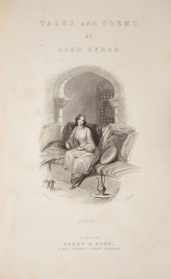 In 8°. Illustrato con 46 incisioni in acciaio a piena pagina e nel testo di Edward Findes da disegni di Henry Warren. Pregevole legatura originale in piena pelle a 5 nervi con piatti e dorso figurati in oro con i titoli di alcune opere di Lord Byron, titoli in oro al dorso e tagli dorati.
