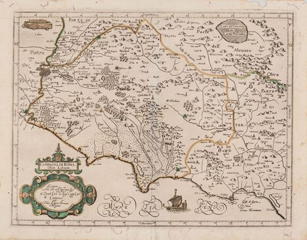 Carta geografica del basso Lazio con Roma, colorata d'epoca, tratta da "L'Italia" stampata in veste definitiva a Bologna nel 1620 da Fabio Magini alla morte del padre, celebre geografo, cartografo, astronomo e matematico padovano la cui opera costituisce il primo atlante italiano, il cui incipit è costituito dalla carta di Bologna del 1594-5. Diviso per la prima volta coi confini del Tevere e dell'Aniene la carta del Lazio iniziata nel 1607 circa trae spunto da quelle cinquecentesche del Buonsignori, del Danti, del Bellarmato e finanche di quella di Eufrosino della Volpaia. Il Magini si avvalse di due dei maggiori incisori del tempo, Benjamin Wright ed Arnoldo Arnoldi. Entro cornice moderna di legno argentato cm 67x81