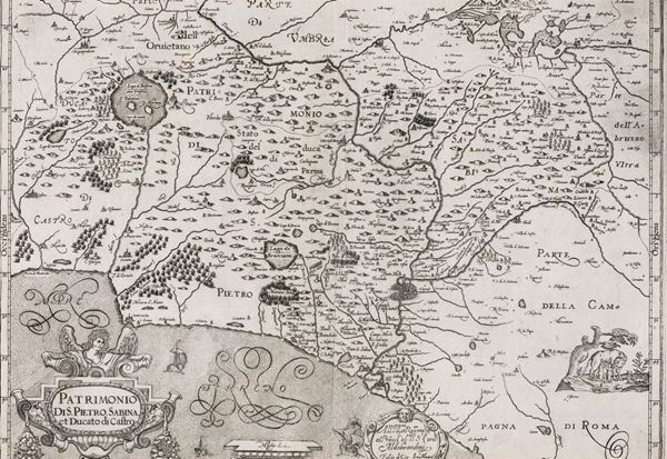 Carta geografica dell'alto Lazio tratta da "L'Italia" stampata in veste definitiva a Bologna nel 1620 da Fabio Magini alla morte del padre, celebre geografo, cartografo, astronomo e matematico padovano la cui opera costituisce il primo atlante italiano, il cui incipit è costituito dalla carta di Bologna del 1594-5. Diviso per la prima volta coi confini del Tevere e dell'Aniene la carta del Lazio iniziata nel 1606 circa, trae spunto da quelle cinquecentesche del Buonsignori, del Danti, del Bellarmato e finanche di quella di Eufrosino della Volpaia. Il Magini si avvalse di due dei maggiori incisori del tempo, Benjamin Wright ed Arnoldo Arnoldi. Entro cornice moderna di legno color noce cm 49x62.