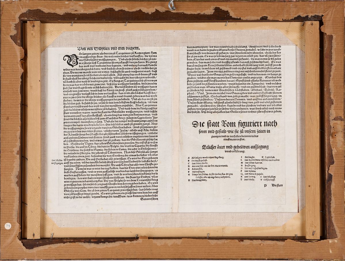 Grande veduta di Roma in xilografia su doppio foglio intero, dall'edizione tedesca della cosmografia di Sebastian Münster, pubblicata nel 1550 con il titolo Cosmographey o Descrizione di tutti i paesi da Heinrich Petri a Basilea. Entro cornice moderna dorata
