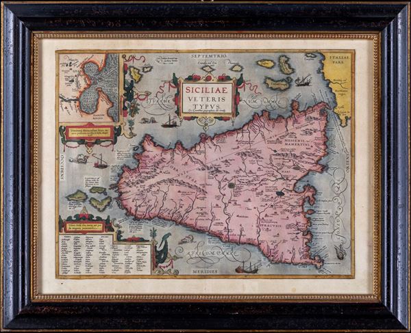 Incisione su rame tratta dal 'Theatrum Orbis Terrarum' dato alle stampe per la prima volta il 20 maggio 1570 da Gilles Coppens de Diest ad Anversa. Tre edizioni in latino, oltre a una in olandese, una in francese e una in tedesco, fecero la loro comparsa prima della fine del 1572; ben 25 edizioni furono pubblicate prima della morte di Ortelius avvenuta nel 1598 e molte altre furono pubblicate dopo la sua scomparsa tanto che l'atlante continuò ad essere richiesto fino al 1612. Il Teatro del mondo è considerato il primo vero atlante moderno, una raccolta di mappe con testi a supporto che formavano un libro impreziosito dall'aggiunta di stampe su rame. Splendida coloritura antica all'acquarello. In alto a sinistra presenta un riquadro con Siracusa e dintorni, in basso a sinistra una legenda con l'antica toponomastica. Entro cornice moderna in legno laccato e dorato. Provenienza: Libreria Antiquaria Perini Verona