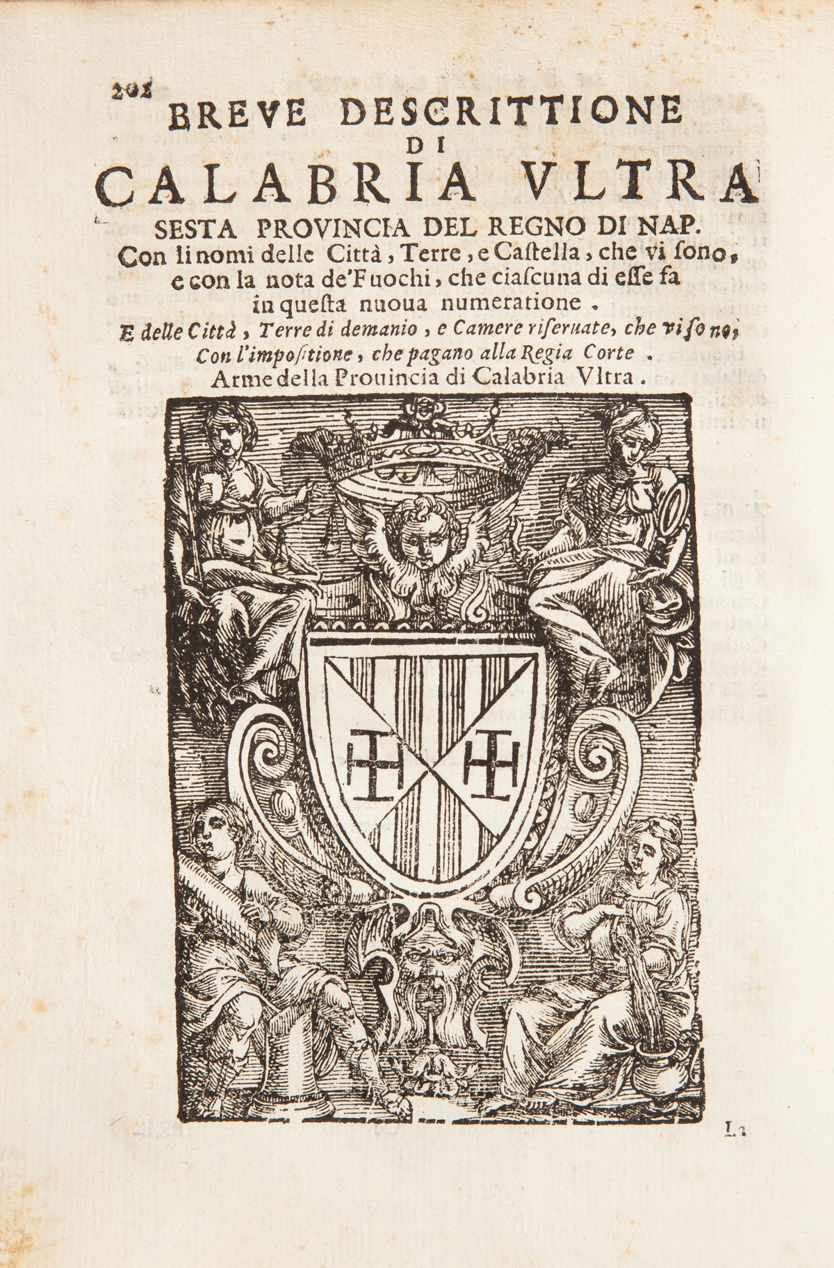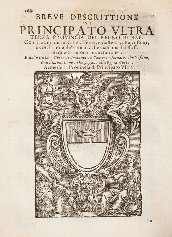Settima edizione di questo esaustivo e dettagliato compendio di storia napoletana, opera del poligrafo e stampatore Ottavio Beltrano, nativo Terranova di Sibari. Attivo come editore a Napoli, Ancona, Sorrento. L'opera costituisce il suo testo principale e vide la luce nel 1640, successivamente ristampata in numerose edizioni con notevole successo. Legatura coeva in piena pergamena con titolo manoscritto al dorso. Leggermente slegato.