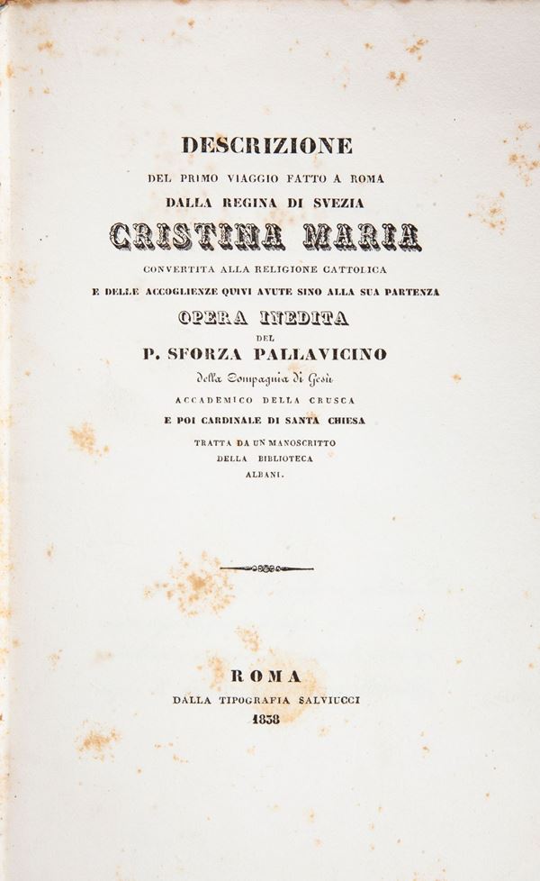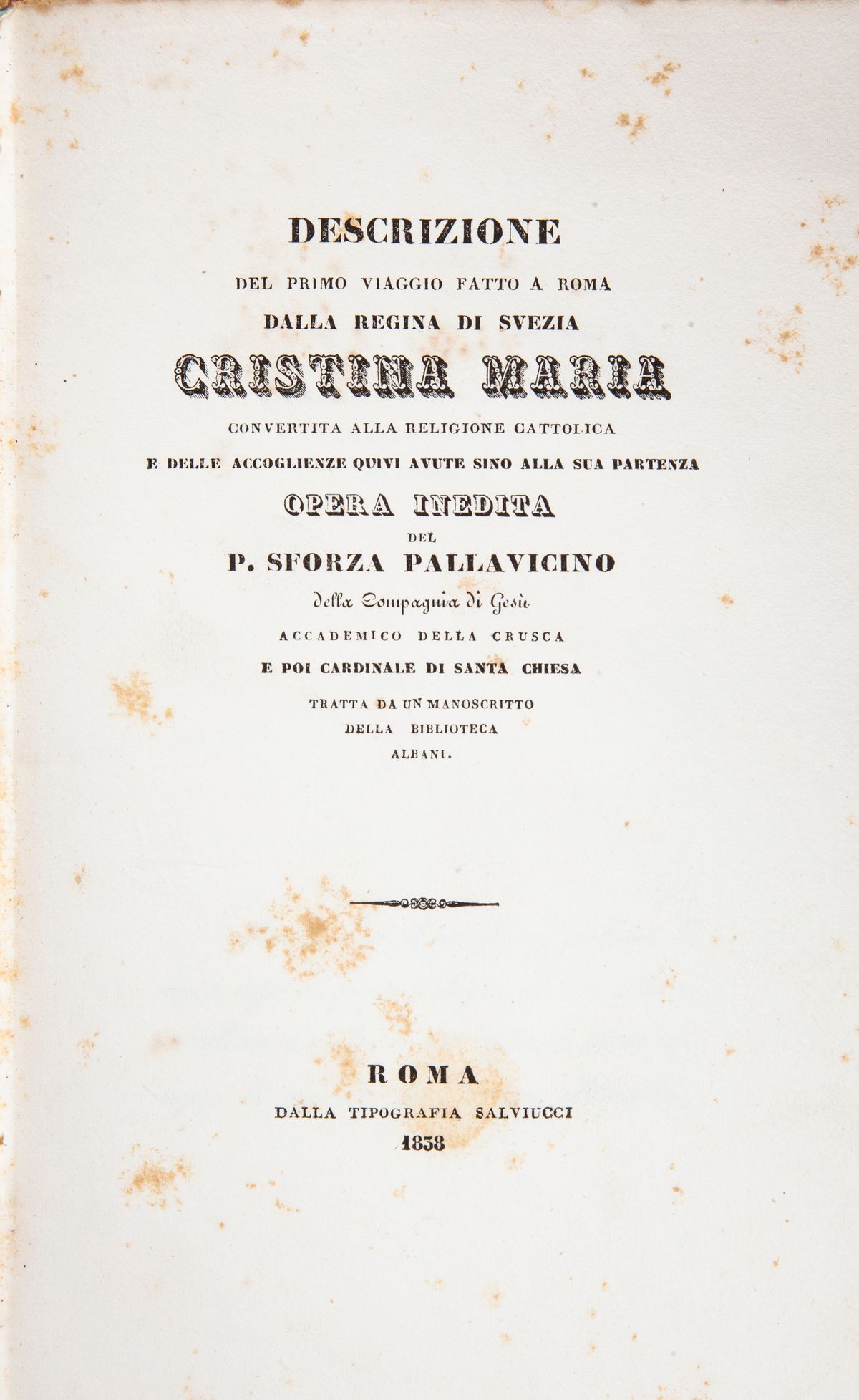 Pietro Pallavicino Sforza - Descrizione del primo viaggio fatto a Roma dalla Regina di Svezia Cristina Maria Convertita alla religione cattolica alla religione cattolica e delle accoglienze quivi avute sino alla sua partenza. Opera inedita (...) tratta da un manoscritto della Biblioteca Albani, Salviucci, Roma 1838