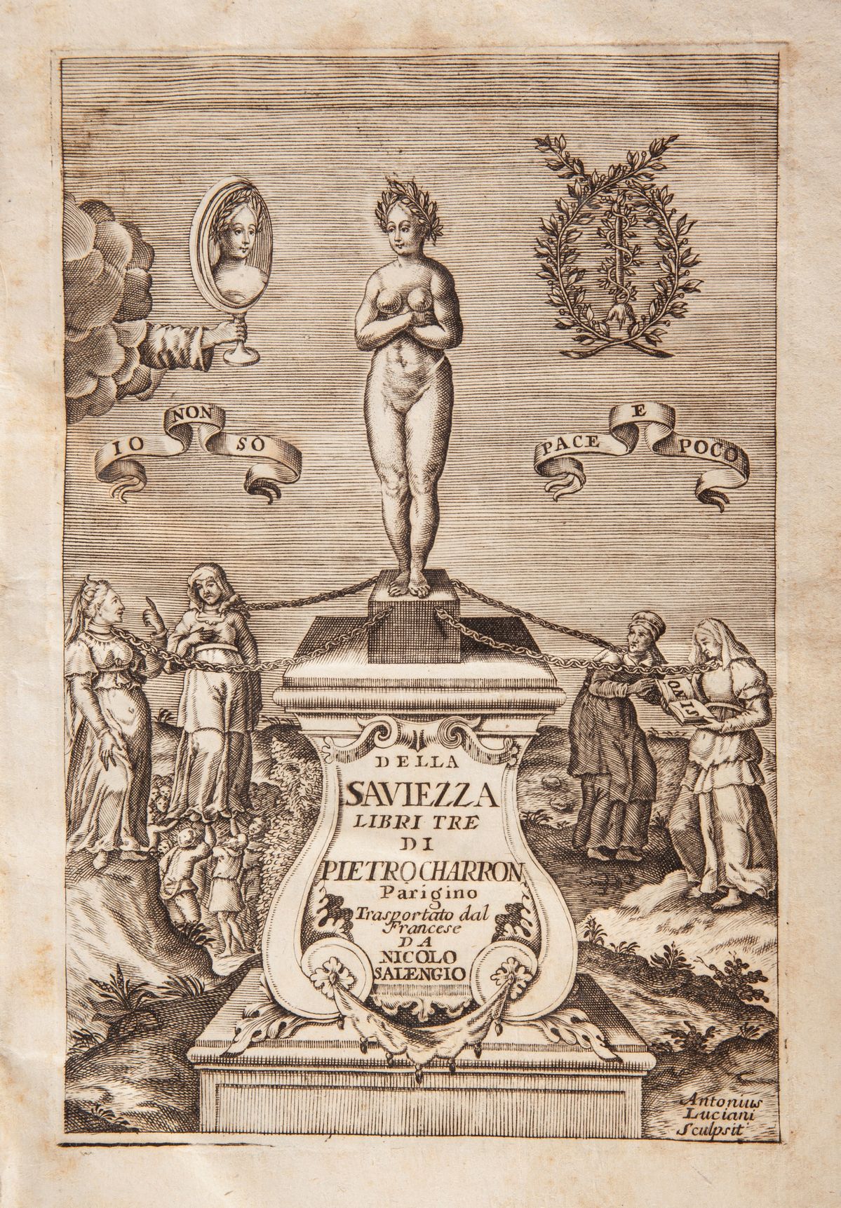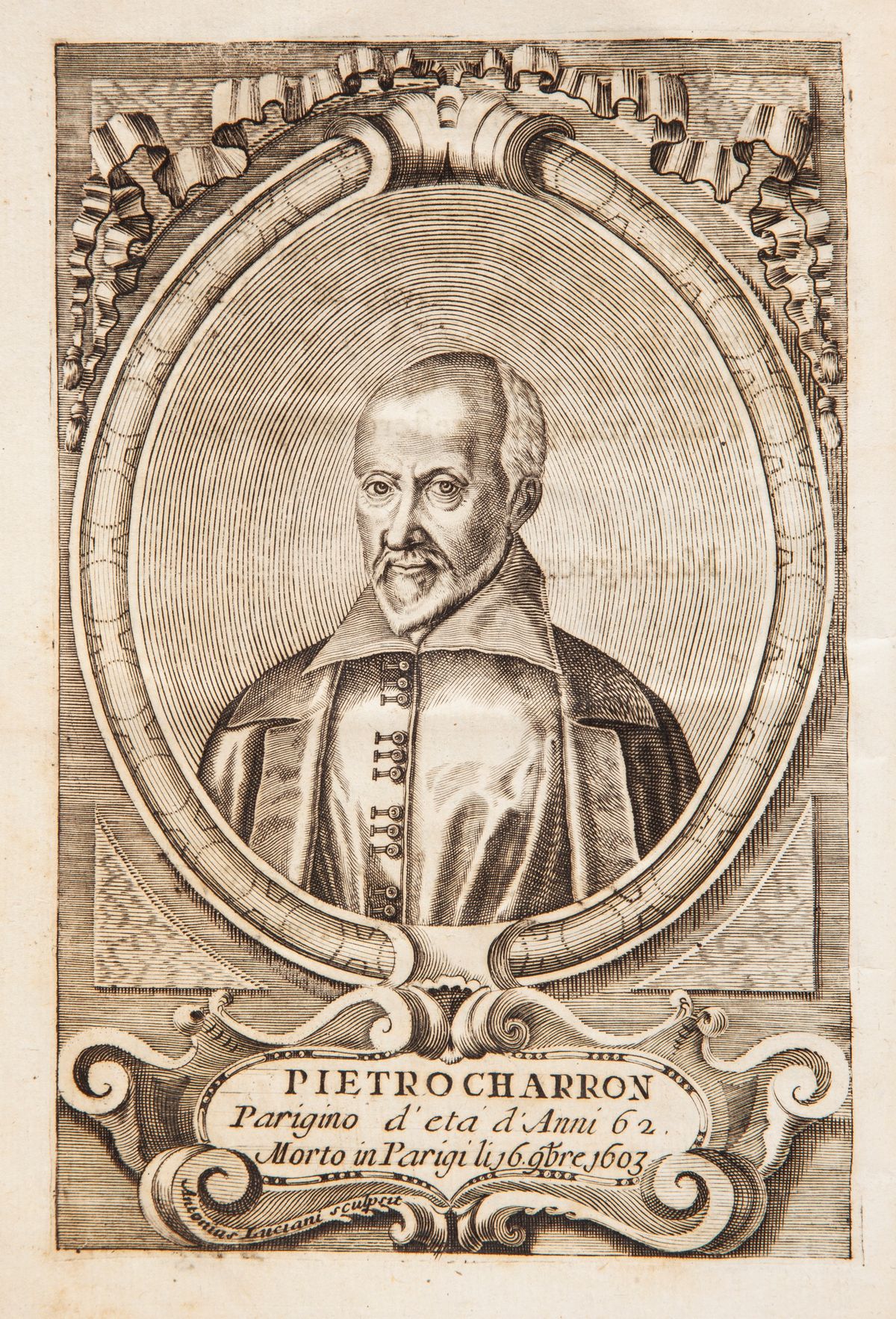 Illustrato con Antiporta figurato con un'incisione allegorica, e con una tavola raffigurante il ritratto dello Charron, ambedue di Antonio Luciani. Bella traduzione in italiano sull'originale di Bordeaux del 1601, di un libro messo all'Indice e condannato per le teorie della filosofia del dubbio, ritenute poi patrimonio dei cosiddetti spiriti forti. Amico del Montaigne (che gli morì tra le braccia), nell'intento di promuovere la tolleranza nella Parigi devastata dalle guerre confessionali scivolò nel relativismo. Legatura coeva in piena pergamena con tassello di pelle con titolo in oro al dorso.