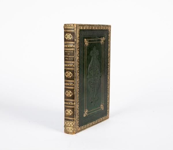 In 8° Testo su due colonne. L'apparato delle note è al fine, contiene la traduzione dell'Iliade di Omero, In morte di Ugo Bassville, le Elegie, Canzoni per le nozze, le Tragedie ed altre poesie minori. Splendida legatura in marocchino verde con fregi incisi a secco e in oro ai piatti e titoli e fregi in oro al dorso. Tagli spruzzati.