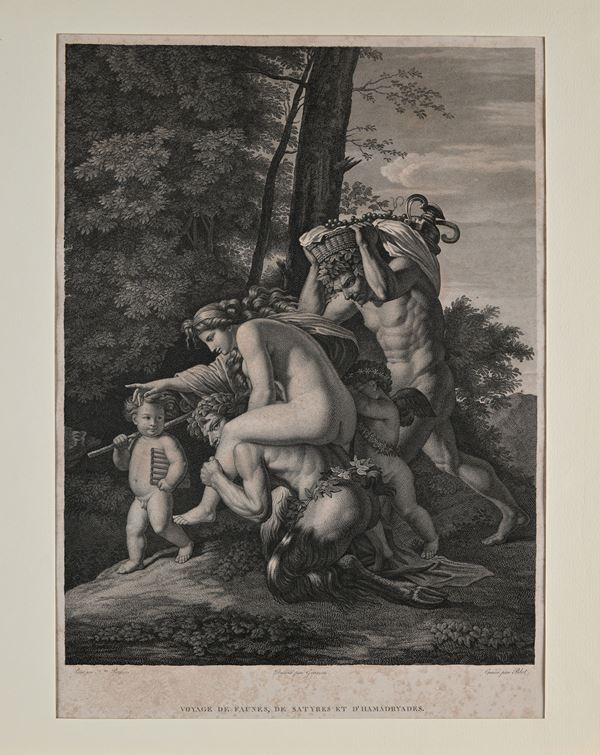 Viaggio di fauni, satiri e amadriadi da un'invenzione di Poussin. Blot incisore parigino, allievo di A. De Saint-Aubin, autore di opere di riproduzione, fra le quali la più nota é Le Verrou da Fragonard.