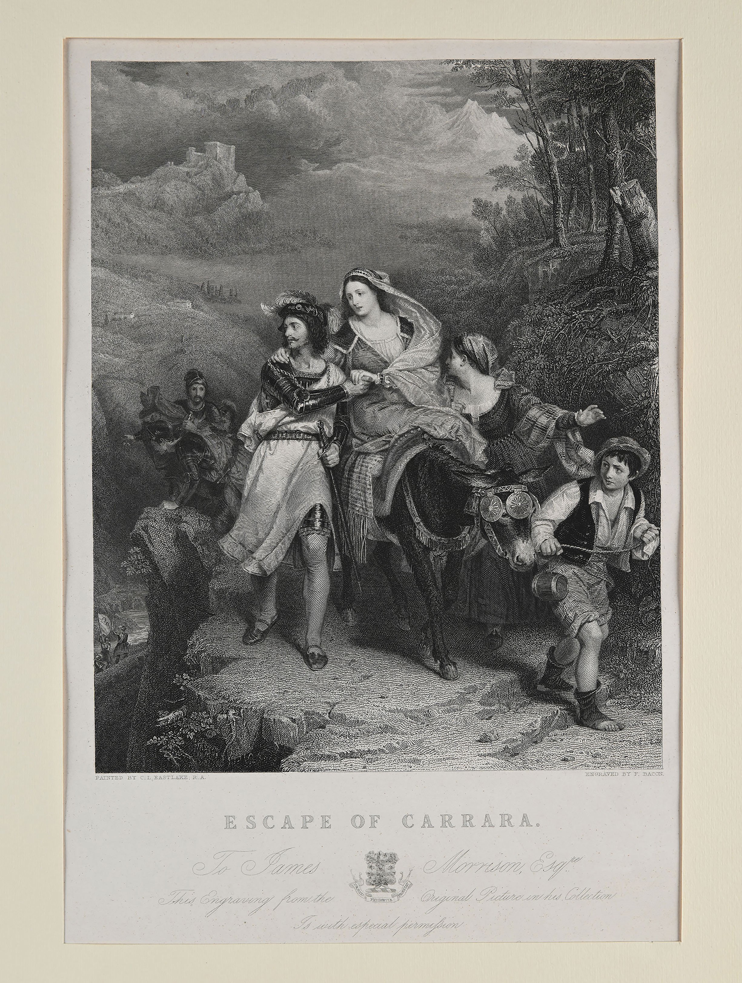 - Charles Lock Eastlake R.A., Escape of Carrara, Inciso da Francis Bacon cm 36x25. Dall'opera la Fuga di Francesco Novello Carrara dal duca di Milano, dipinta dal maestro del Romanticismo inglese Eastlake, episodio del 1389 che raffigura l'ultimo signore di Padova che fugge da Gian Galeazzo Visconti, tratto da una Storia delle repubbliche italiane nel Medioevo di Simondo de Sismondi .
