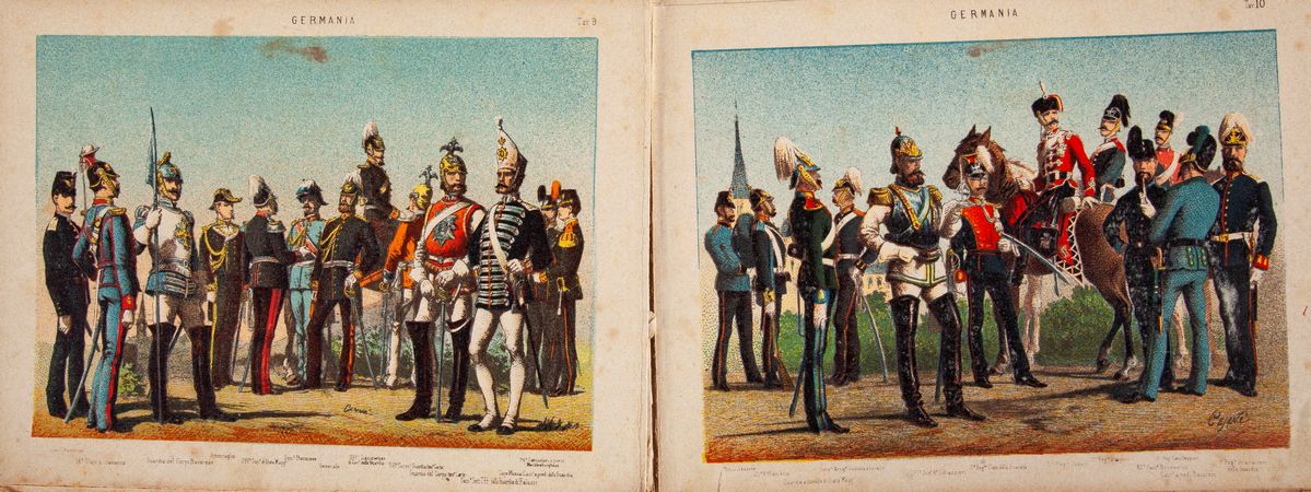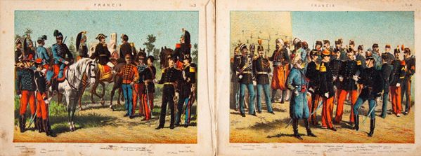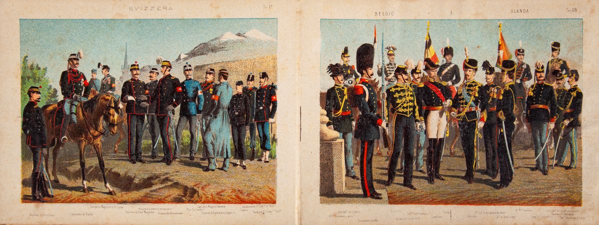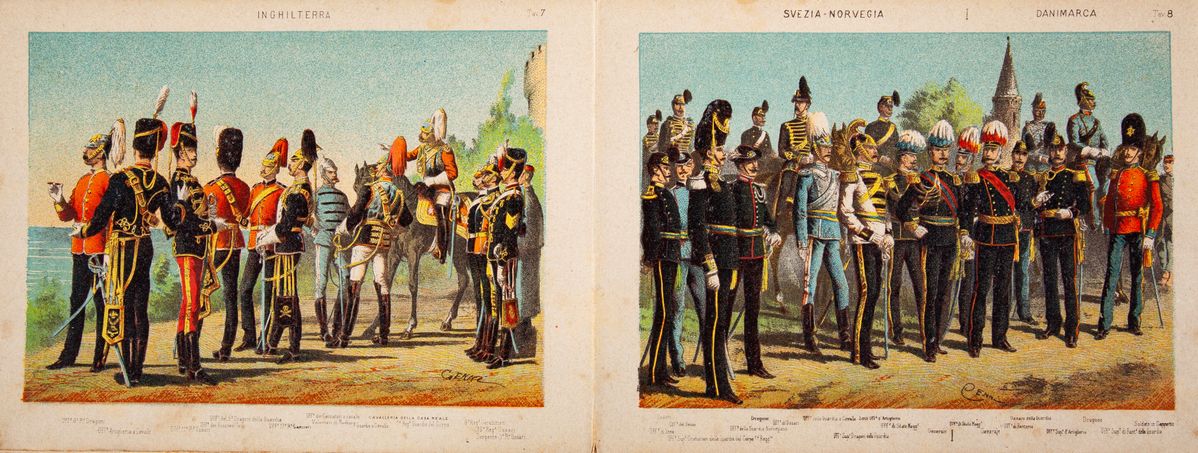 In 4° oblungo. Legatura originale in mezza tela e cartonato illustrato a colori contenente 18 tavole a colori raffiguranti le divise delle principali armi degli eserciti europei dell'ultimo terzo del XIX secolo.