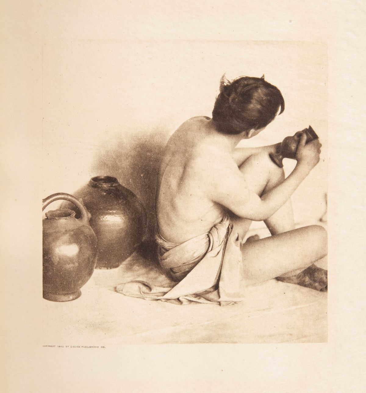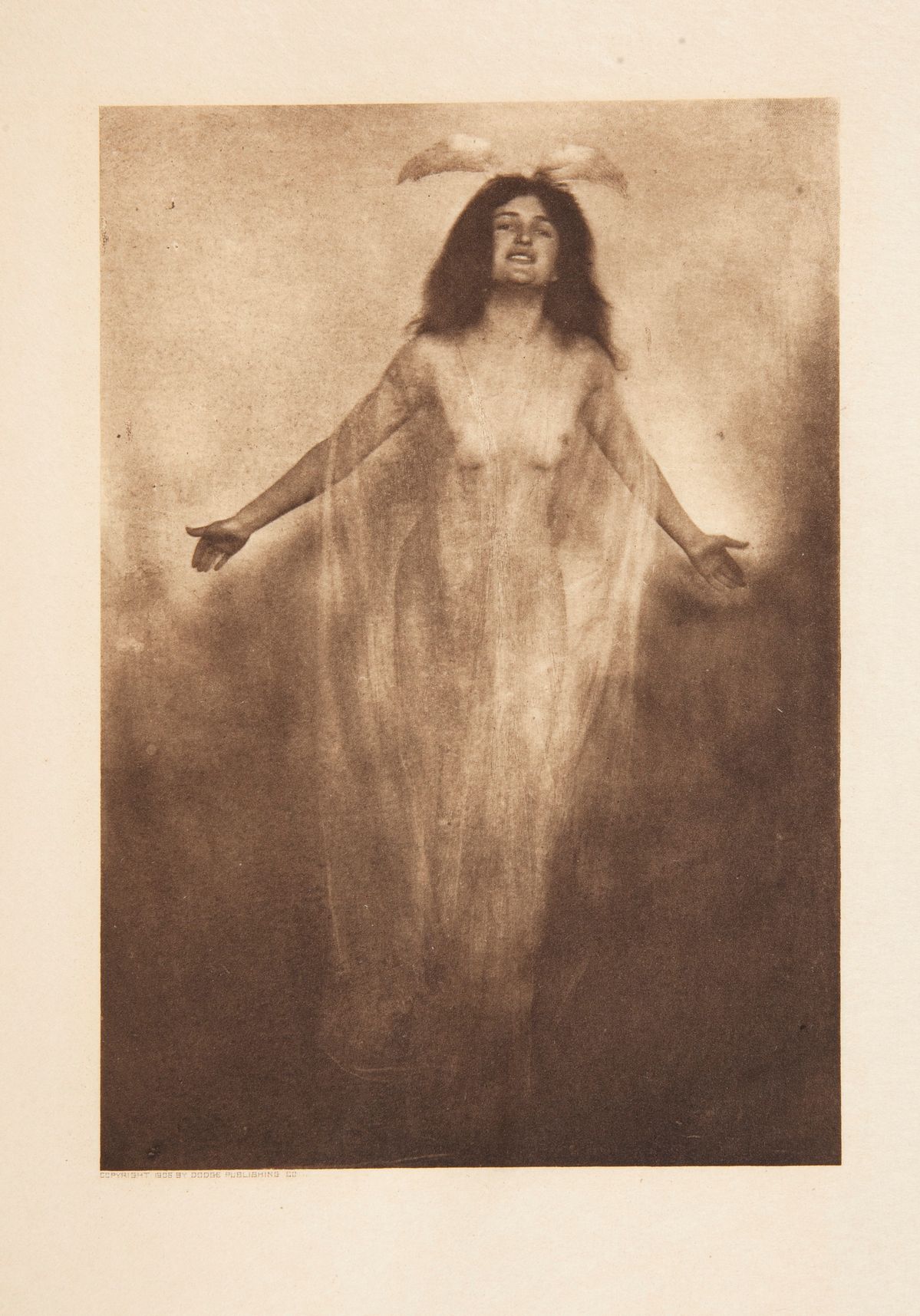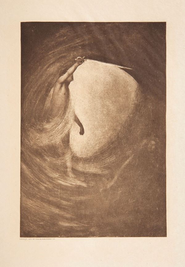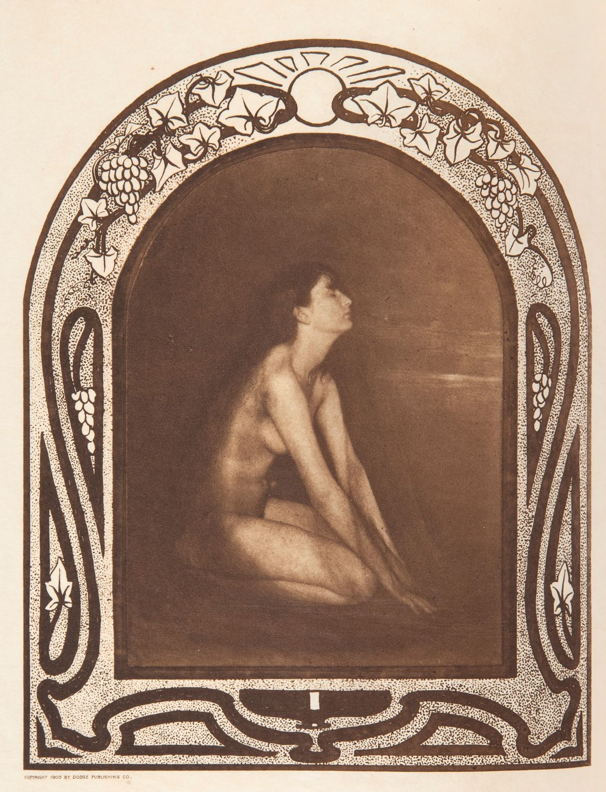 In 4° piccolo. Senza impaginazione. Prima edizione che presenta le rivoluzionarie illustrazioni fotografiche della fotografa pittorialista californiana Adelaide Hanscom: 28 fotoincisioni color seppia stampate direttamente su carta velina. Le illustrazioni delle edizioni successive sono attribuite anche a Blanche Cumming. Opera il cui titolo venne dato da Edward Fitzgerald alla sua traduzione dal persiano all'inglese del 1859 di una selezione di quartine (rubāʿiyāt) attribuite a Omar Khayyam (1048–1131), soprannominato "l'astronomo-poeta della Persia". All'inizio non ebbe un gran successo commerciale, ma il lavoro di Fitzgerald venne reso popolare dal 1861 in poi da Whitley Stokes, al punto da essere molto ammirato dai preraffaelliti in Inghilterra. Il libro divenne estremamente popolare in tutto il mondo anglofono al punto che si formarono numerosi "club Omar Khayyam" e si creò un vero e proprio culto di fin de siècle. Legatura coeva in mezza pelle con angoli in pelle e con titoli e fregi in oro al dorso. In parte ancora intonso.