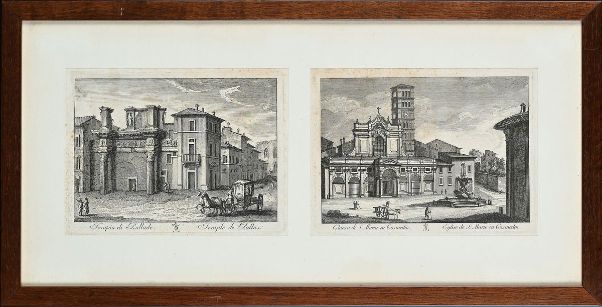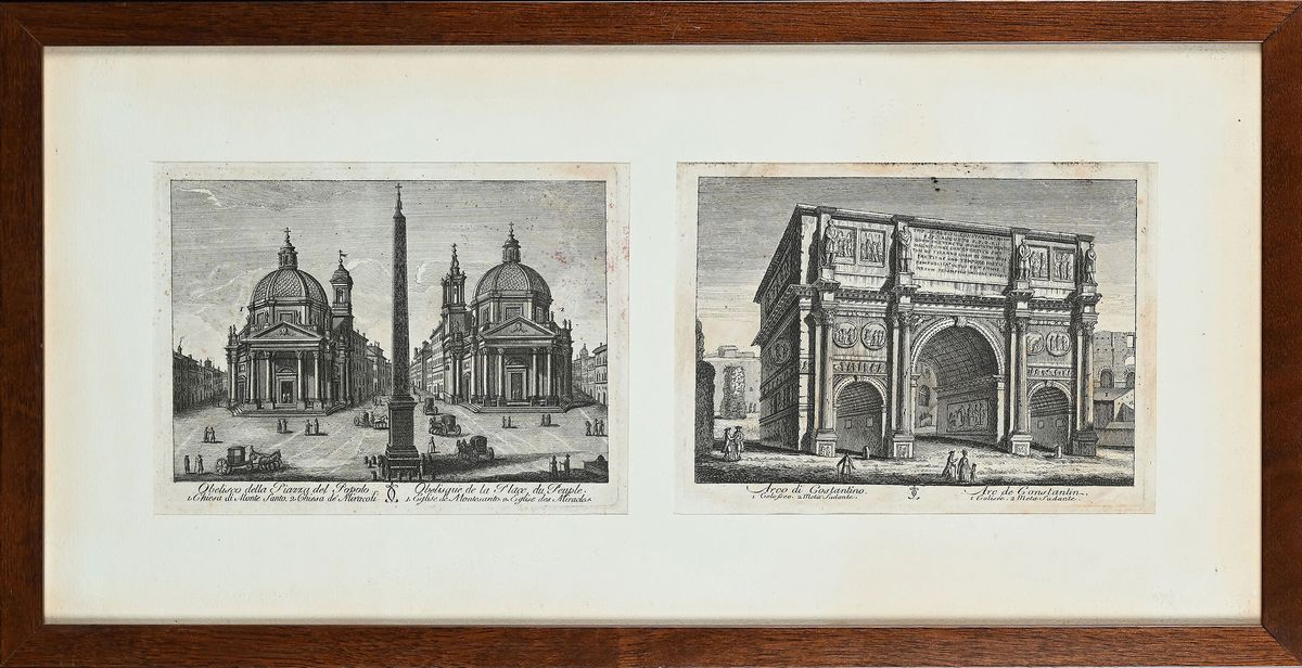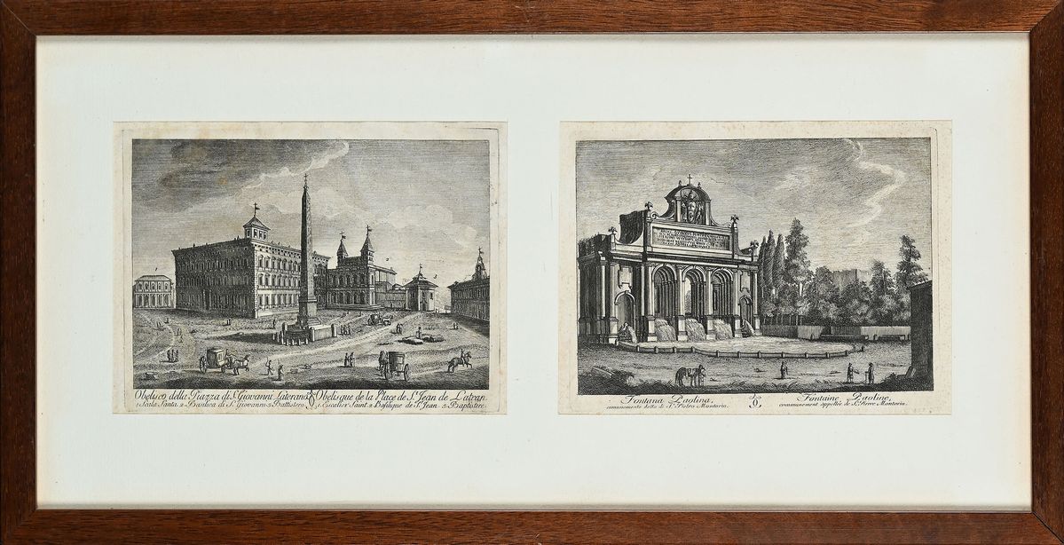 Acqueforti pubblicate nel 1816 circa a Roma, presso l'Antonelli, nella "Nuova Raccolta di cinquanta principali vedute antiche e moderne, dell'alma città di Roma e delle sue vicinanze". Composte entro tre cornici moderne in legno color noce cm 28,5x55,5.