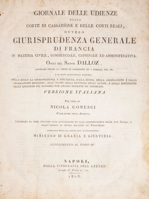 In 4° Completo in XIII Volumi, XII Volumi più il volume di Appendice al Volume IV. Versione in italiano di Paduano e Comerci del Monumentale repertorio metodico di giurisprudenza opera dell'Avvocato ed uomo politico francese Dalloz, che vide la luce a Parigi in 24 volumi nel 1824-5, in questa versione arricchito con annotazioni della giurisprudenza del Regno delle 2 Sicilie. Legatura in piena pergamena coeva con tassello in pelle ai dorsi.