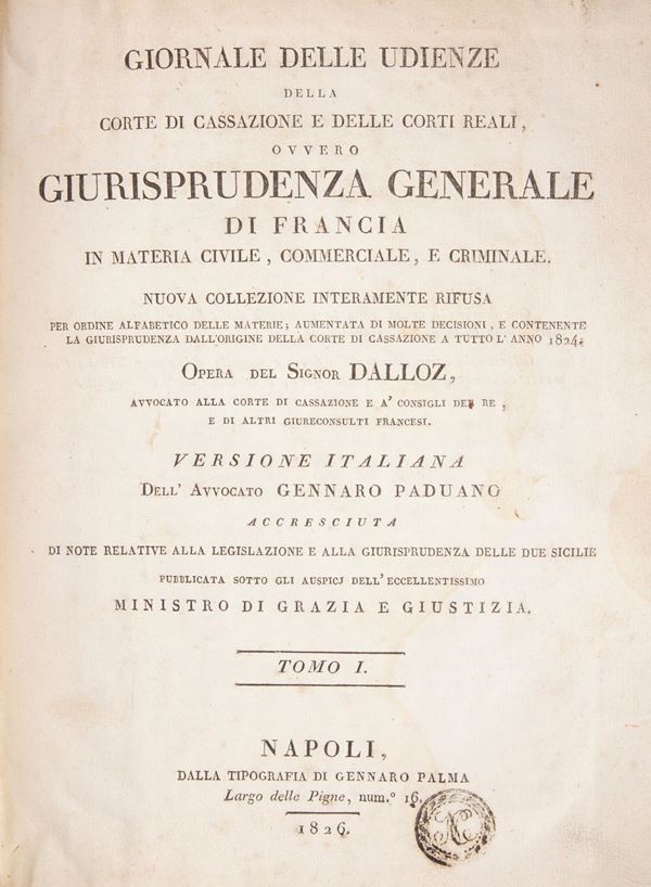 Victor Alexis Desire Dalloz - Giornale delle udienze della Corte di Cassazione e delle Corti Reali, ovvero Giurisprudenza generale di Francia in materia civile, commerciale e criminale Nuova collezione interamente rifusa (...) Accresciuta di note relative alla legislazione ed alla giurisprudenza delle Due Sicilie. Tomo I-XII e supplemento al IV Volume, Gennaro Palma, Napoli 1826/1828
