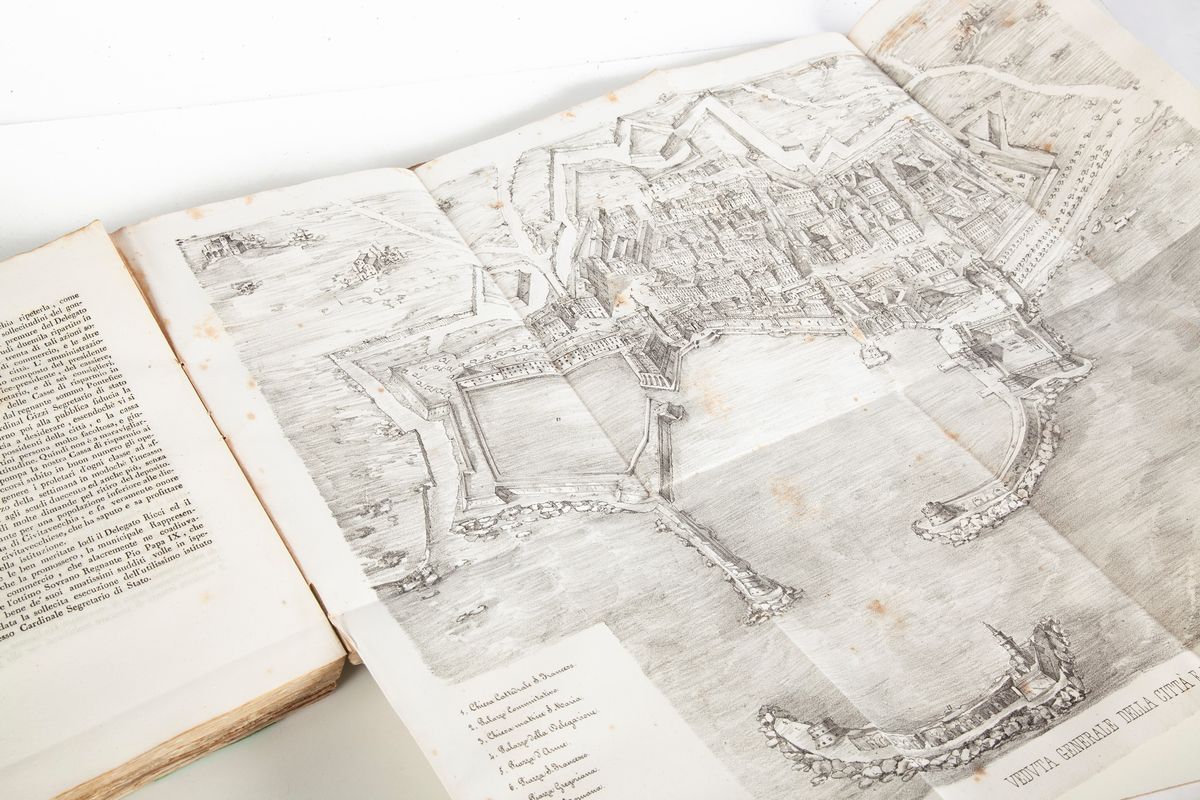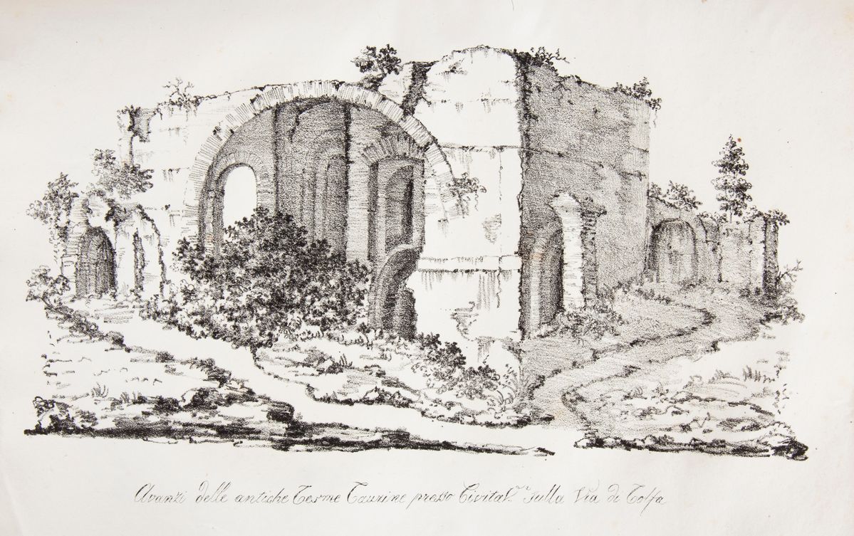 In Folio piccolo. Illustrata con 7 litografie (di cui 3 ripiegate le altre a piena pagina): la Pianta del porto di Traiano, il Braccio di bronzo della statua di Nettuno rinvenuta nel fondo della Darsena di Civitavecchia, gli Avanzi delle antiche taverne, la Pianta delle terme taurine, S.Ferminia, La veduta del porto e della città, e L'Antimurale del porto. Divisa in due parti: la prima tratta gli avvenimenti dalle origini della città fino all’invasione dei saraceni dell’849, la seconda sviluppa in particolare la storia dei secc. XVIII-XIX. L'autore riuscì a raccogliere studi e soprattutto testimonianze dirette sulle vicende che avevano toccato Civitavecchia dall’insorgenza antifrancese del 1798-1799 in poi e a costituire quindi un’importante fonte di riferimento per i successivi studi storici sulla città. Brossura editoriale originale verde con titolo stampato al piatto superiore.