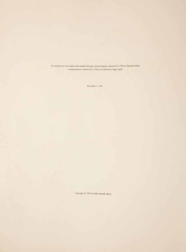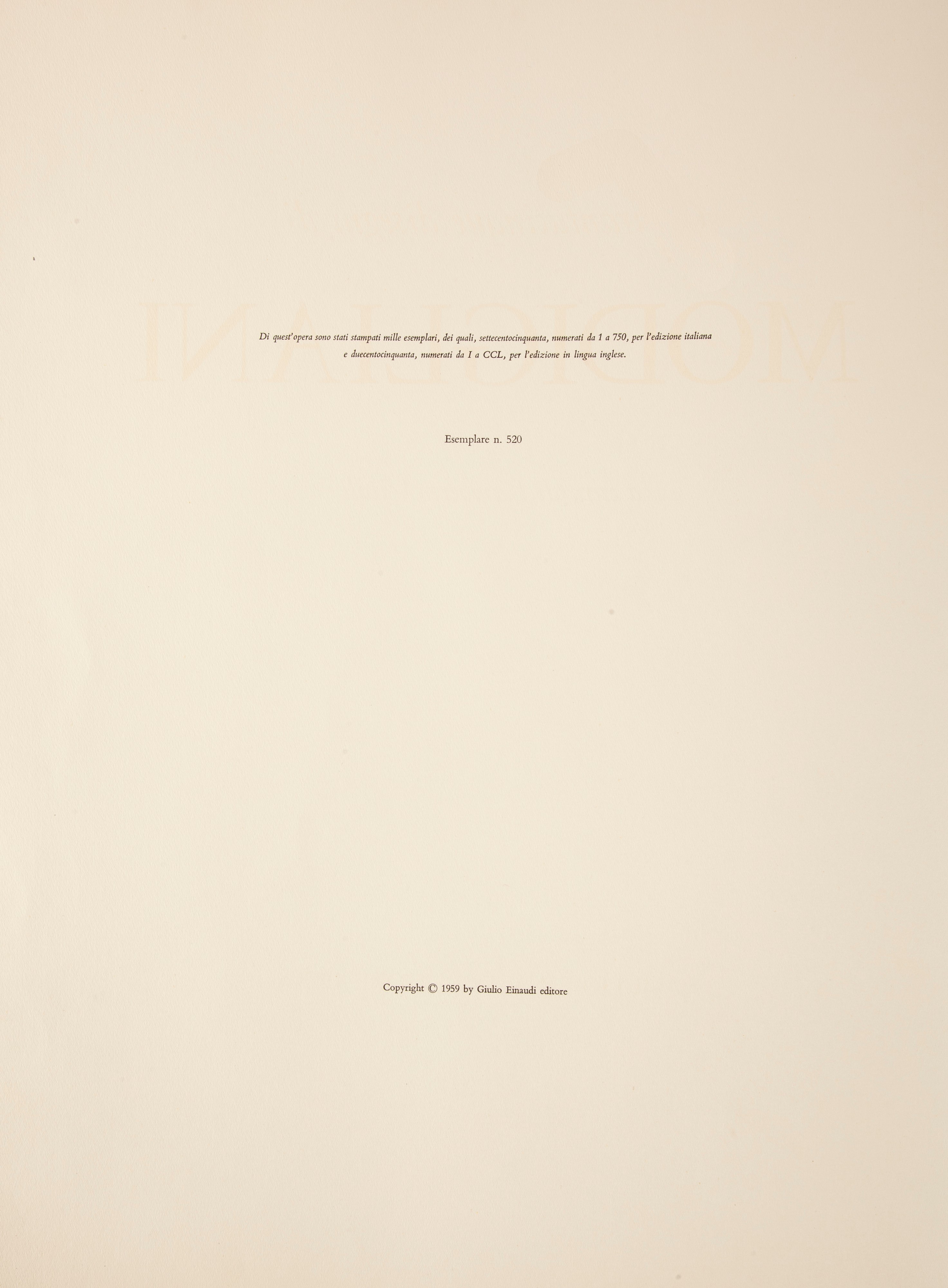 Edizione a tiratura limitata di 750 Esemplari, ns. n. 520. Cartella originale rivestita in tela contenente 45 tavole numerate di disegni del Maestro Modigliani. Entro scatola originale di cartone.