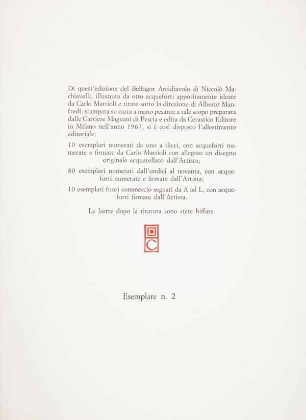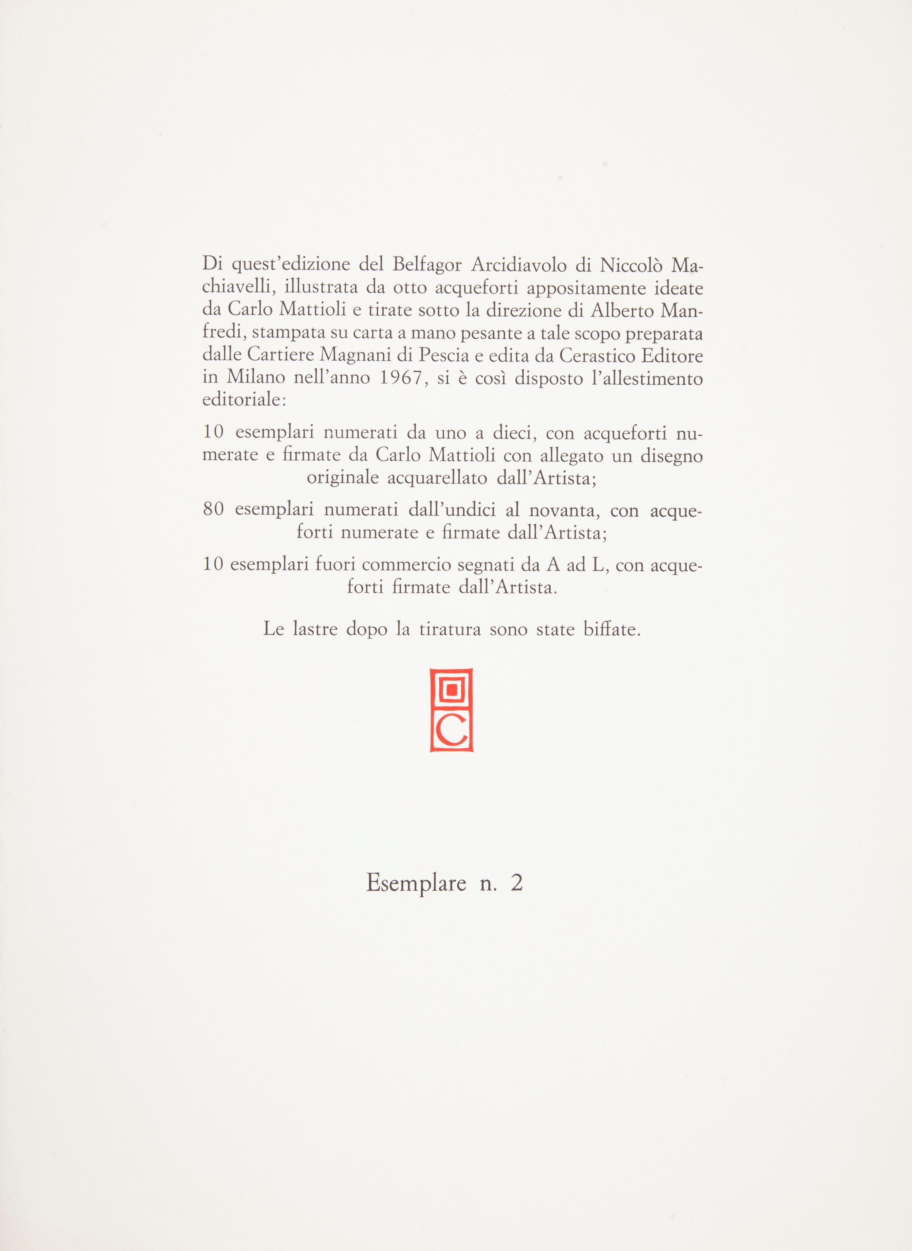 Belfagor. Novella piacevolissima di Niccolò Macchiavelli. Illustrato da un acquerello ed 8 acqueforti di Carlo Mattioli, Cerastico, Milano 1967