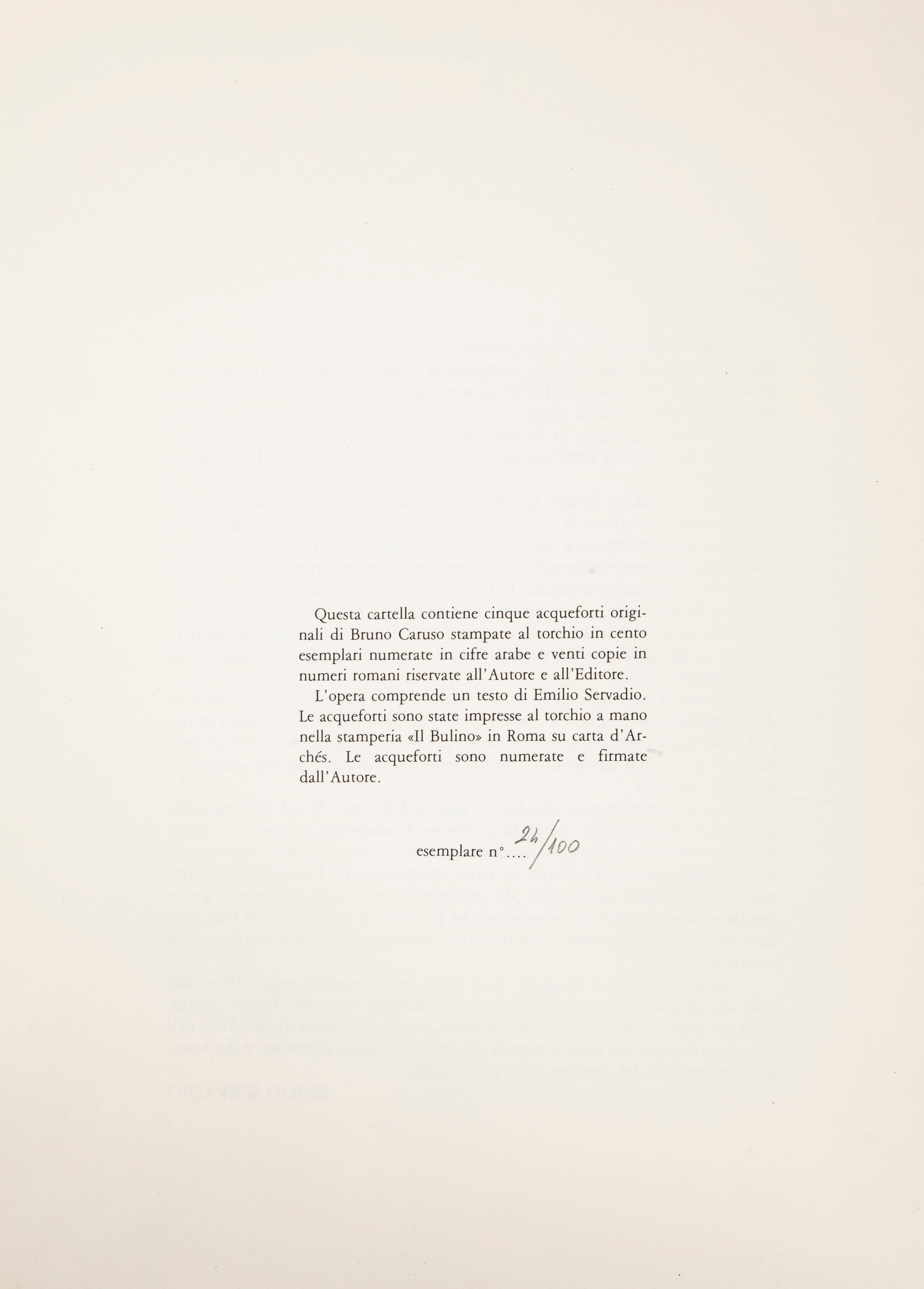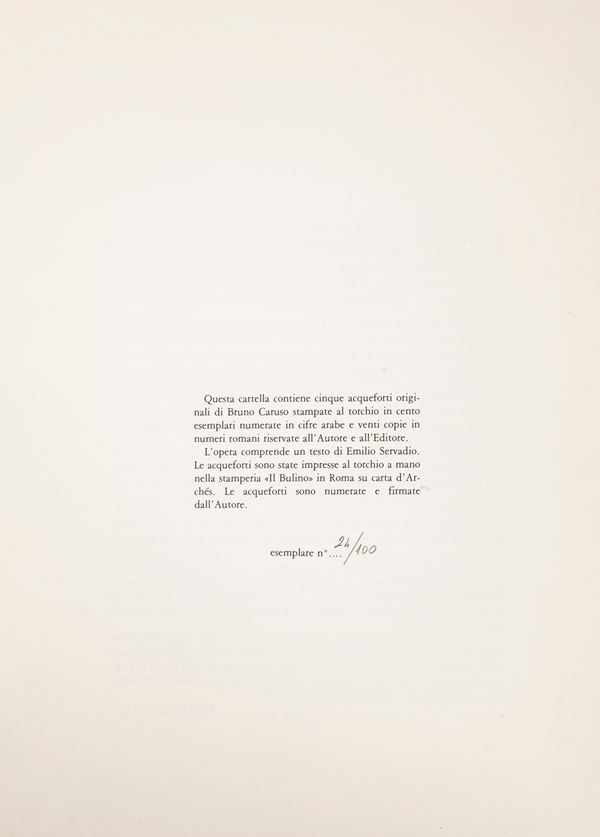 Cartella completa contenente 5 acqueforti protette da veline impresse al torchio a mano di Bruno Caruso, in tiratura limitata di 100 esemplari, tutte firmate e numerate "Caruso 24/100", cm 35x25 l'una, presso la stamperia "Il Bulino" in Roma su carta d'Archés.