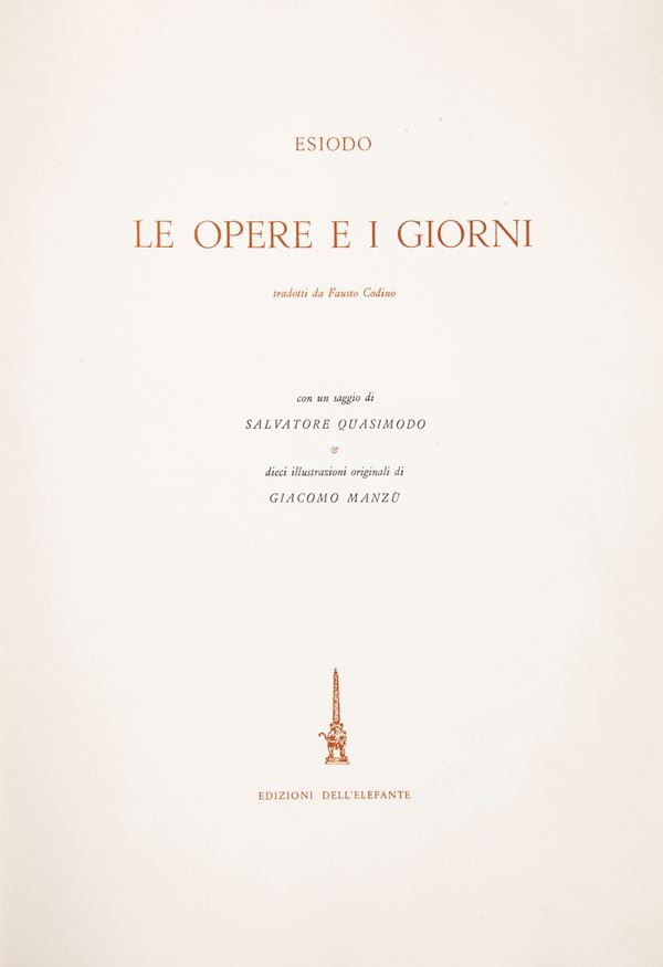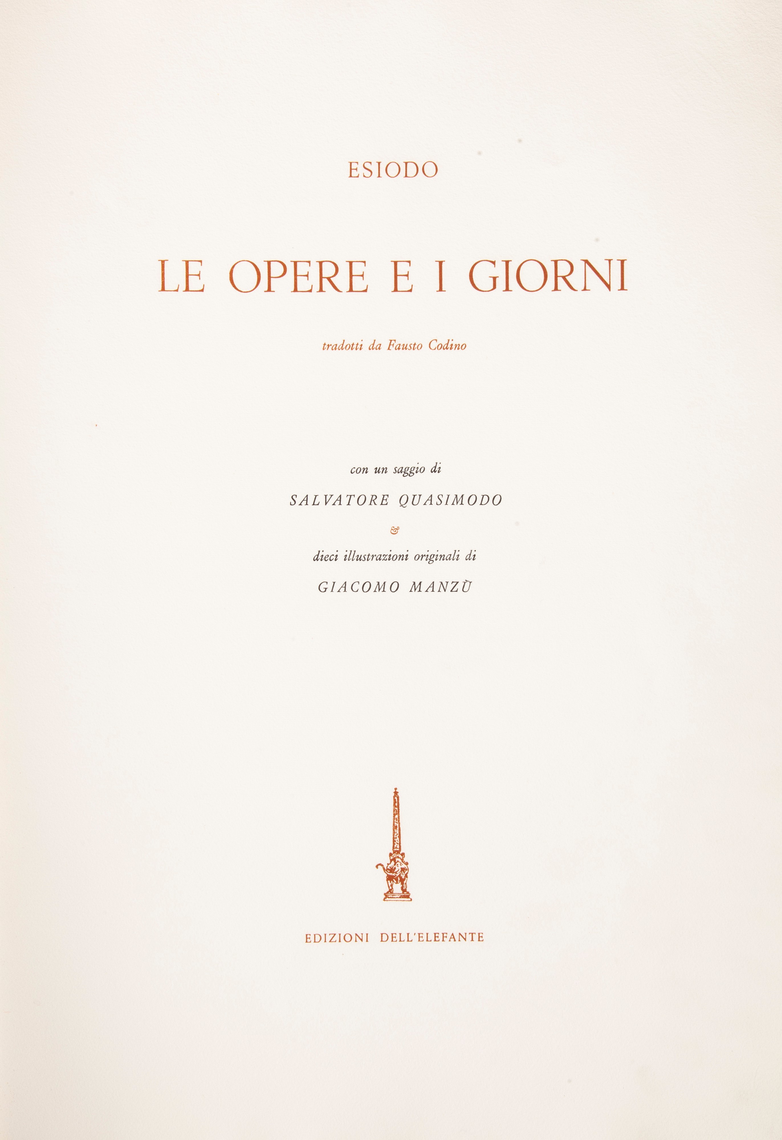 Esiodo - Le opere e i giorni. Con un saggio di Salvatore Quasimodo. Con dieci illustrazioni originali di Giacomo Manzù., Edizioni dell' Elefante, Roma 1966
