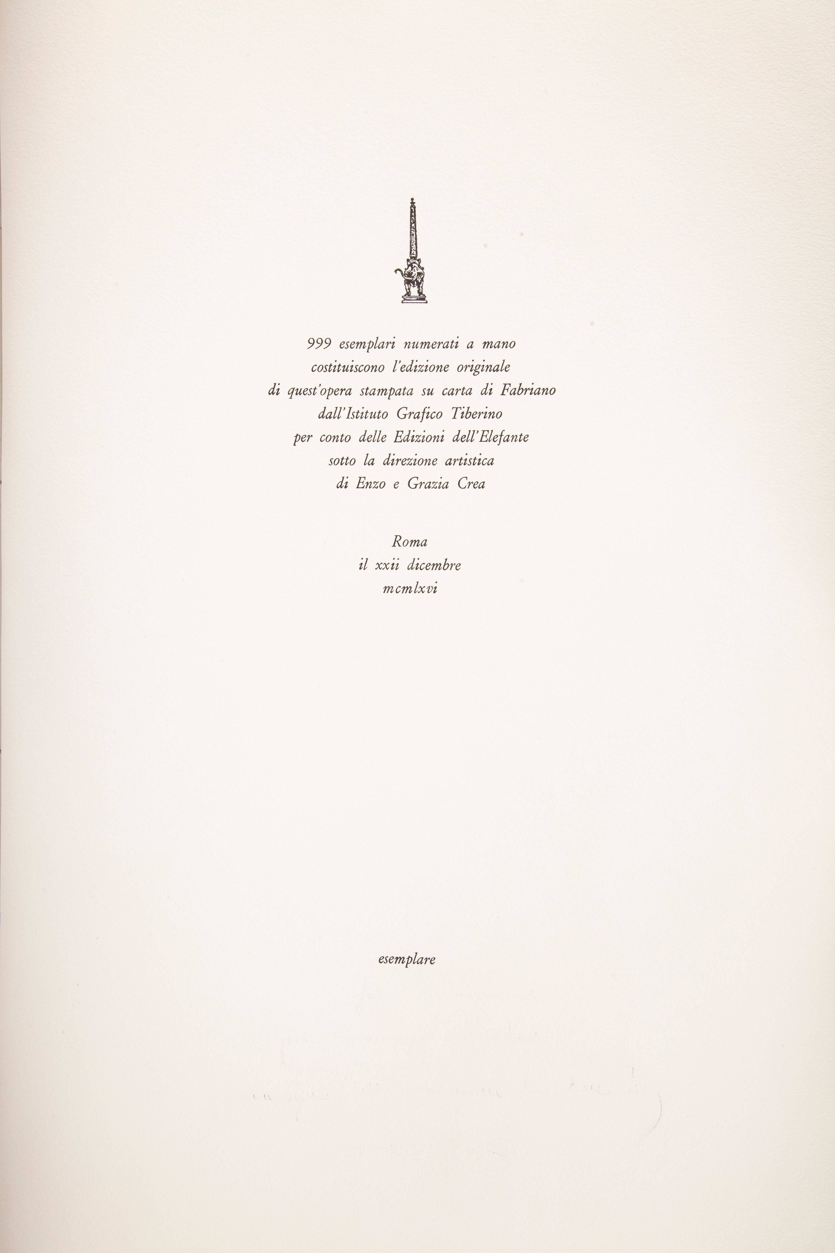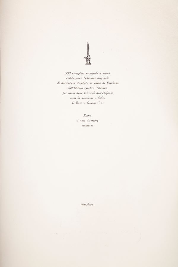 Edizione limitata tirata a 999 esemplari numerati. Ns. esemplare non numerato. Preziosa legatura in pelle con piatti in legno e dorso con nervi e titolo in oro. Stampato su carta Fabriano dall'Istituto Grafico Tiberino di Roma a cura di Enzo Crea. Entro cofanetto originale (con lievi difetti).