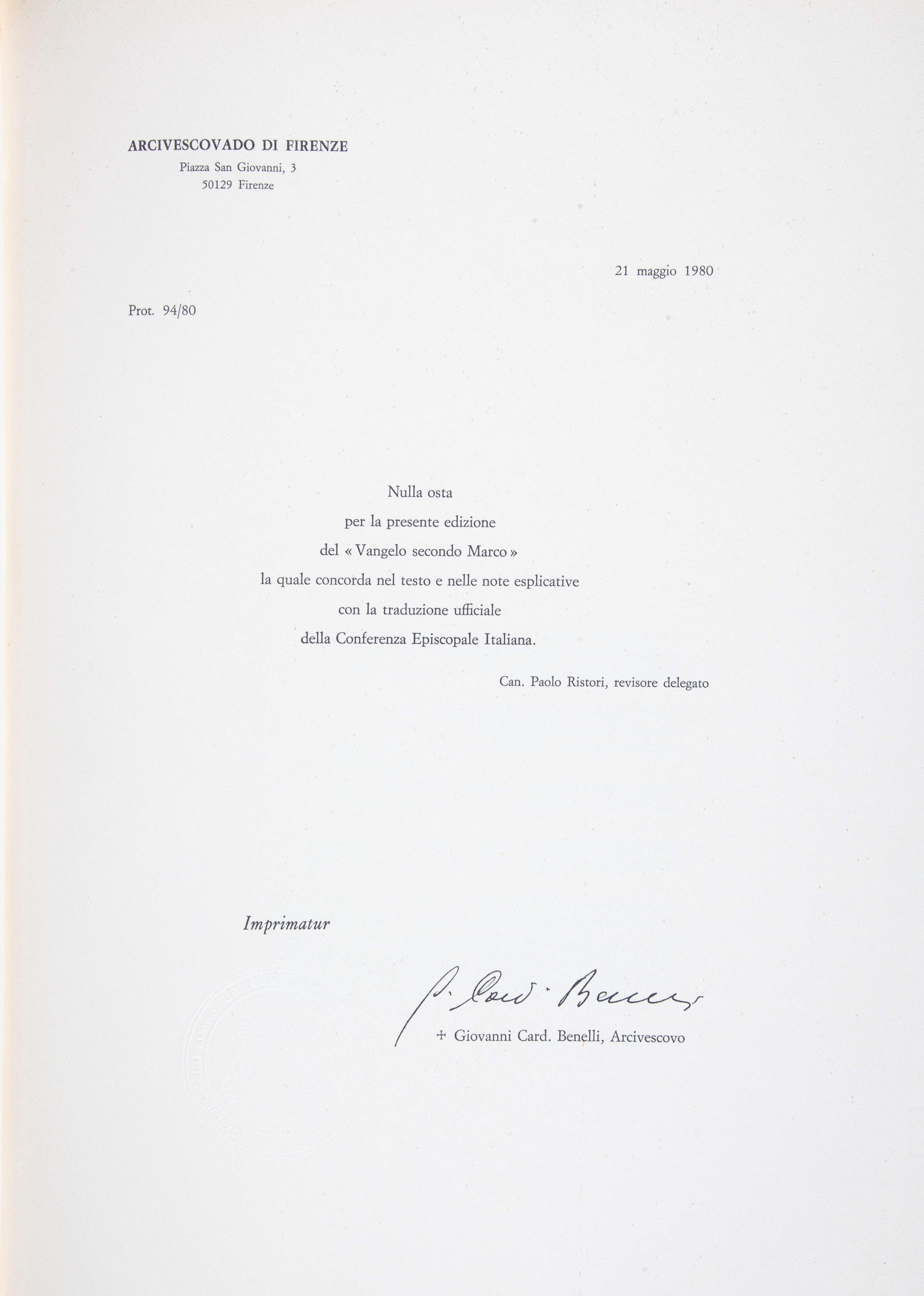 Tiratura limitata a 1499 Esemplari autografati dal Maestro Sassu ns. n. 21. Edizione dei Vangeli con illustrazioni inedite a cura di Corrado Marsan. Legatura editoriale in tutta pelle, entro cofanetto originale in tela.